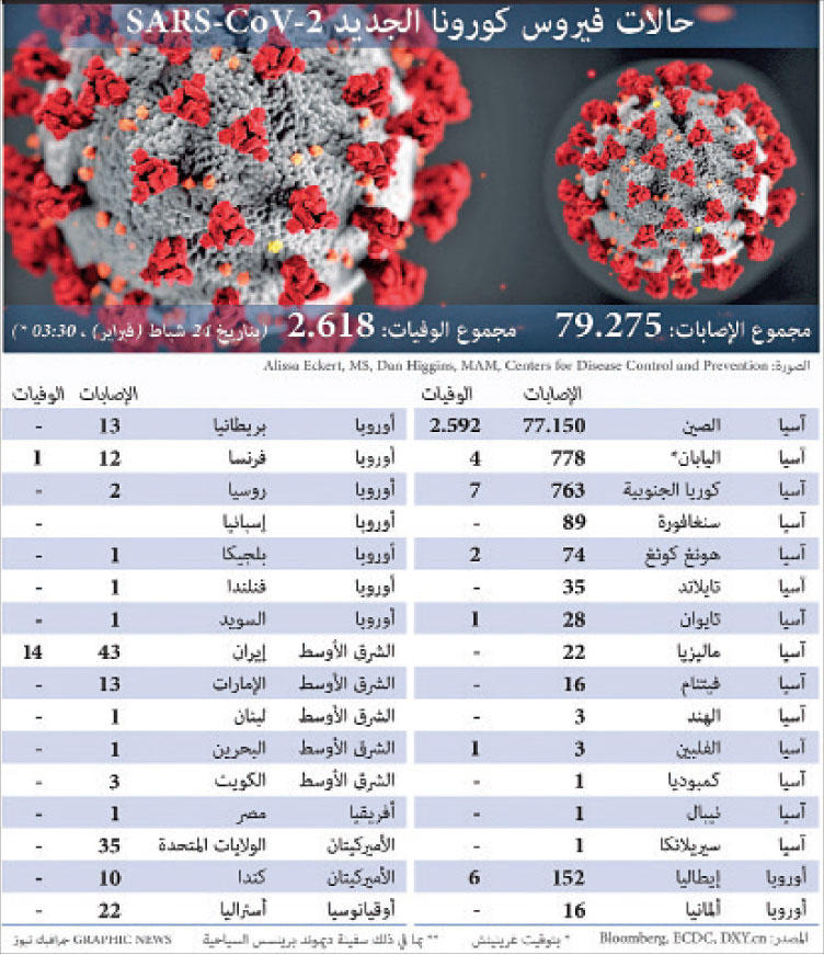 ساء الوضع في المنطقة أمس، مع زيادة حالات الوفيات بسبب فيروس كورونا الجديد COVID19 خارج الصين، إذ ارتفع ضحاياه في إيران إلى 14 وفاة، في حين سجّلت كل من البحرين وسلطنة عُمان والعراق إلى جانب الكويت أولى الإصابات، في وقت استمرّ عدد الوفيات في الارتفاع بإيطاليا وكوريا الجنوبية.
