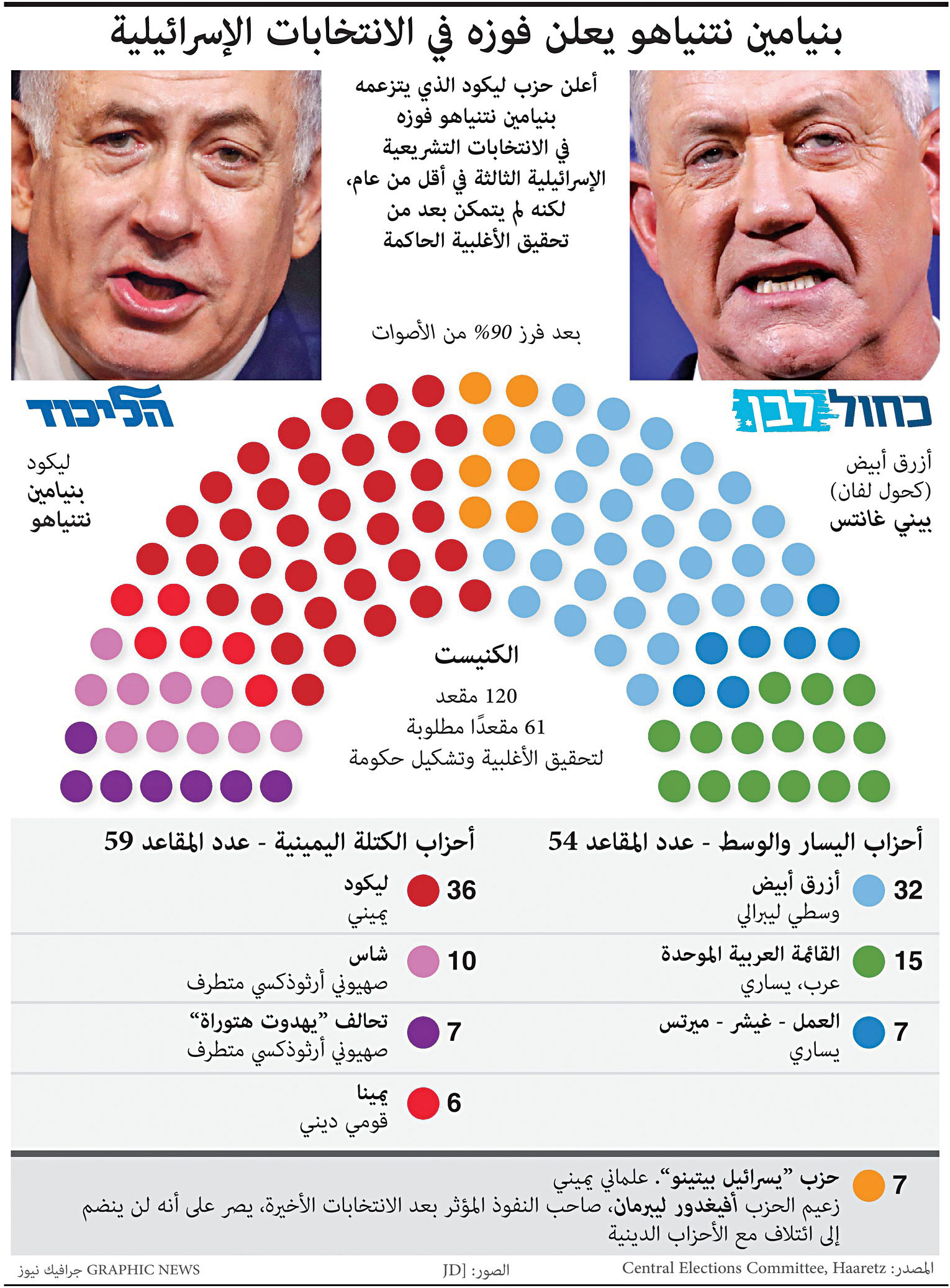 حقق حزب "الليكود" بزعامة رئيس حكومة تصريف الأعمال بنيامين نتنياهو نصراً "غير مكتمل"، وحل أولاً في النتائج الأولية لانتخابات "الكنيست" البرلمان، التي أجريت أمس الأول، دون أن يتمكن من تحقيق أغلبية تخوله تشكيل الحكومة الجديدة منفرداً، في حين اعترف خصمه الرئيسي تحالف "أزرق أبيض" بزعامة قائد الجيش السابق بيني غانتس بـ"خيبة الأمل".وأظهرت النتائج الأولية لانتخابات الكنيست الـ23، بعد فرز %90 من الأصوات، حصول كتلة اليمين على 59 مقعدا، في حين ارتفع عدد مقاعد "القائمة المشتركة" إلى 15 مقعداً، بعد أن سجلت أعلى نسبة تصويت بالبلدات العربية منذ 1999.ووفقا للنتائج الرسمية المرحلية التي أعلن عنها، أمس، يحصل حزب "الليكود" على 36 مقعداً، وتحالف "أزرق أبيض" على 32 مقعداً، و"القائمة المشتركة" على 15 مقعداً، و"شاس" على 10 مقاعد، و"يهدوت هتوراه" على 7 مقاعد، و"يسرائيل بيتنو" بزعامة إفيغدور ليبرمان على 7 مقاعد، وتحالف "العمل، غيشير، ميرتس" على 7 مقاعد، وتحالف أحزاب اليمين المتطرف "يمينا" على 6 مقاعد.