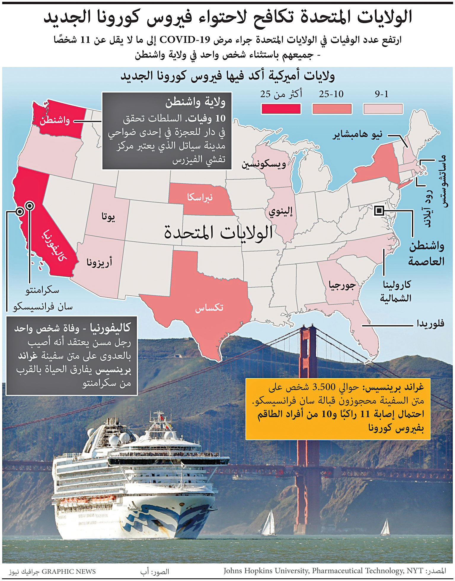 وأعلنت الولايات المتحدة أن شخصين توفيا في ولاية فلوريدا أمس الأول، ما يرفع اجمالي الوفيات الى 17، والاصابات الى 227، بينها 70 في ولاية واشنطن.كما تمّ تشخيص إصابات لدى 21 شخصاً على متن سفينة «غراند برنسيس» السياحيّة قبالة ساحل كاليفورنيا، وفق ما أعلن نائب الرئيس الأميركي مايك بنس الذي ينسّق جهود مكافحة الفيروس في الولايات المتحدة.وقال بنس، في مؤتمر صحافي بواشنطن، إن عيّنات أُخذت من 46 شخصًا، وإنّ 21 من بينهم «ثبتت إصابتهم بكورونا».والمصابون هم 19 من أفراد الطاقم واثنان من ركاب «غراند برنسيس» التي كانت قطعت رحلتها بعد اكتشاف أعراض لدى بعض الركاب، وعددهم 3533، ولدى بعض افراد الطاقم.وكان الرئيس الأميركي دونالد ترامب قال من البيت الأبيض «إنّها سفينة كبيرة، علينا اتّخاذ قرار مهمّ».وفي سياق متصل، تأكّدت إصابة شخصين بعد مشاركتهما بمؤتمر لوبي «آيباك» المؤيّد لإسرائيل في واشنطن والذي حضره بنس ووزير الخارجية مايك بومبيو إلى جانب العشرات من أعضاء الكونغرس.وإلى جانب بنس وبومبيو، حضر المؤتمر زعيم الأغلبية الجمهورية في مجلس الشيوخ ميتش ماكونيل والمرشح الديمقراطي السابق للانتخابات التمهيدية الديمقراطية مايكل بلومبرغ.
