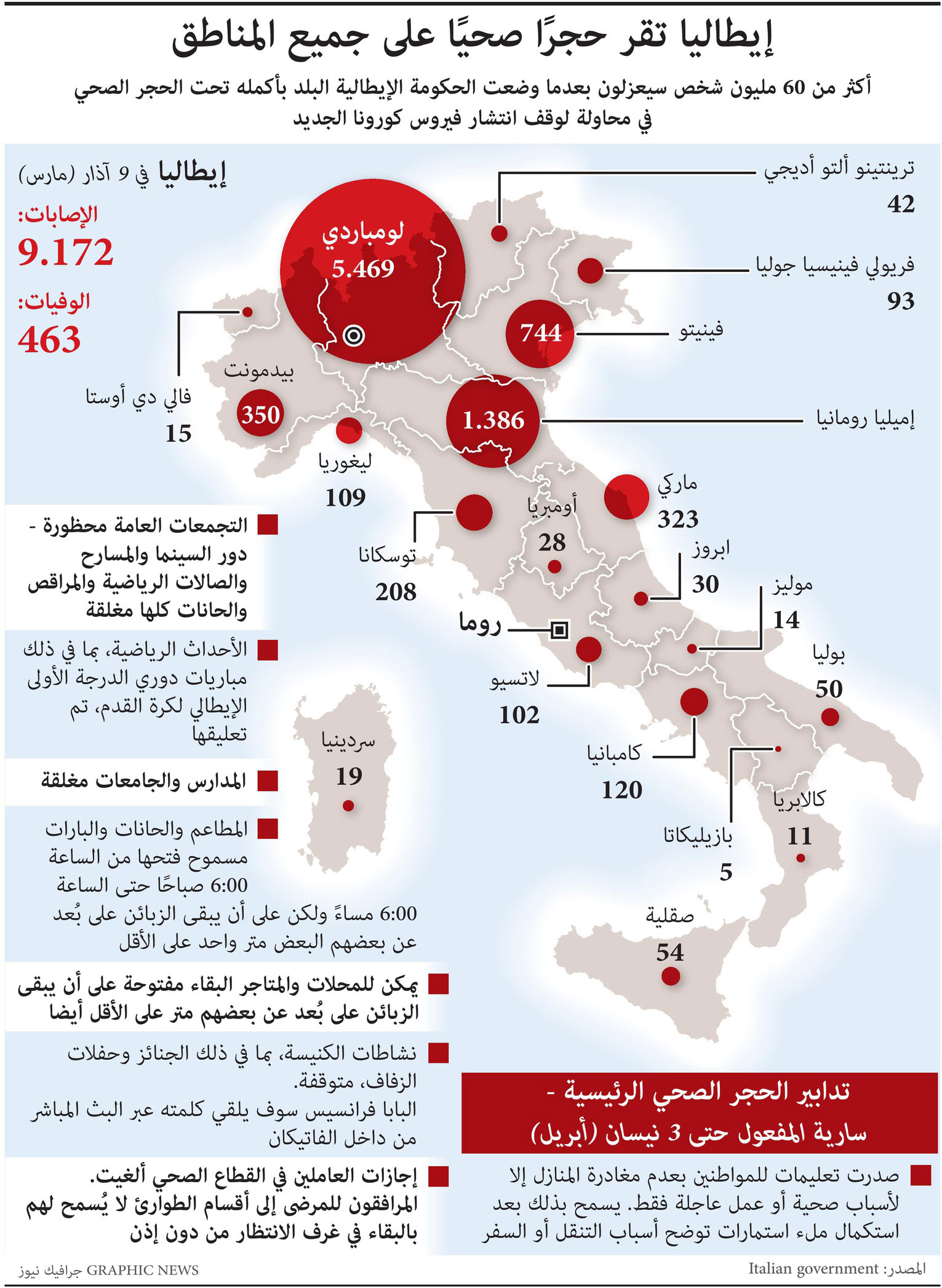 الى ذلك، باتت إيطاليا، العضو في مجموعة السبع، أول دولة في العالم تعمم الإجراءات المشددة جدا في محاولة لوقف انتشار الفيروس، وثاني دولة بعد الصين من حيث عدد الإصابات والوفيات، إذ سجّلت البلاد أكثر من 9 آلاف مصاب بينهم 463 توفوا.فقد طُلب من نحو 60 مليون إيطالي البقاء في منازلهم، مع بدء تطبيق روما إجراءات غير مسبوقة في العالم.وعنونت الصحافة الإيطالية أمس، "الجميع في المنزل" و"كل شيء مغلق"، بعد صدور مرسوم وقّعه رئيس الحكومة الإيطالية جوزيبي كونتي يوسّع الى كل أنحاء البلاد إجراءات الإغلاق الكبرى التي طالت الأحد ربع سكان شمال ايطاليا.وكان كونتي قد مهّد لهذا المرسوم بمؤتمر صحافي عقده في مقرّ الحكومة مساء أمس الأول، ودعا خلاله مواطنيه إلى "ملازمة منازلهم".وبلهجة حازمة قال كونتي: "سأوقّع مرسوماً يمكن تلخيصه بالآتي: ألازم منزلي. لن تعود هناك منطقة حمراء في شبه الجزيرة (...) إيطاليا بأسرها ستصبح منطقة محميّة".وأضاف: "لم يعد هناك وقت لإهداره. الأرقام تخبرنا أنّ هناك ارتفاعاً كبيراً في أعداد المصابين وفي أعداد الراقدين في المستشفيات بأقسام العناية الفائقة، ومع الأسف في أعداد الموتى أيضاً. علينا أن نغيّر عاداتنا. عليها أن تتغيّر الآن".وأوضح رئيس الوزراء أنّه لهذا السبب "قررت أن أعتمد فورا إجراءات أكثر قسوة وأشدّ فعالية"، مشدّداً في الوقت نفسه على أنّ هذه التدابير لن تشمل "الحدّ من وسائل النقل المشترك، وذلك لضمان استمرارية" النشاط الاقتصادي في البلاد، "ولتمكين الناس من الذهاب إلى أعمالهم".وكتب كونتي لاحقاً على "تويتر" مشجعا الناس على تحمّل المسؤولية الشخصية، وقال: "مستقبل إيطاليا في أيدينا. دعونا كلنا نؤدي دورنا ببذل شيء من أجل الصالح العام".وأمرت السلطات الناس بعدم التنقل خلال الأسابيع الثلاثة المقبلة على أقل تقدير إلا لأغراض العمل أو الاحتياجات الصحية أو الطوارئ، وباستثناء ذلك عليهم البقاء في منازلهم. ويتعين على أي شخص يقرر التنقل ملء استمارة يعلن فيها مبرراته ويحملها معه.وفي الصباح الباكر، بدت شوارع روما أهدأ من المعتاد على نحو مخيف، حيث تحركت السيارات بحريّة في الشوارع التي عادة ما تشهد تكدسات مرورية كبيرة، في أجواء مماثلة للجو العام بمدينة ميلانو العاصمة المالية للبلاد، والتي تطبق قيودا أكثر صرامة.ويمكن للمتاجر أن تظل مفتوحة طالما حافظ الزبائن على مسافة متر على الأقل تفصل بينهم.وأعلن الفاتيكان إغلاق كاتدرائية وساحة القديس بطرس، أمس، أمام السياح حتى 3 ابريل في إطار الاجراءات الهادفة الى وقف انتشار فيروس كورونا المستجد.وفي أمستردام، ظهر رئيس الوزراء الهولندي مارك روته على شاشة التلفزيون في بث مباشر لإصدار أوامر لسكان البلاد البالغ عددهم 17 مليونا بالكف عن المصافحة، وسجلت هولندا 321 إصابة، لكن في مفارقة قام هو بمصافحة شريكه في المؤتمر الصحافي.وبينما ارتفعت الوفيات في بريطانيا إلى 6، رجحت نائبة مدير الخدمات الصحية في إنكلترا د. جيني هاريز احتمال ارتفاع الإصابات لتصل إلى الآلاف.