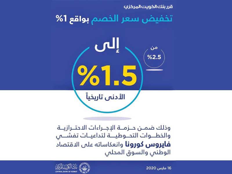 قرر مجلس إدارة بنك الكويت المركزي، أمس، تخفيض سعر الخصم بواقع واحد في المئة من 2.5 إلى 1.5 في المئة، بداية من اليوم، وهو المستوى الأدنى تاريخيا.وقال محافظ «المركزي» د. محمد الهاشل، في تصريح صحافي، إن ذلك يأتي في إطار الإجراءات الاحترازية التي يتخذها البنك لمواجهة الأوضاع الاستثنائية وتداعيات الانتشار الواسع على الصعيد الدولي لفيروس كورونا المستجد (كوفيد - 19)، بما لذلك من تبعات سلبية مؤثرة على النمو الاقتصادي العالمي والوضع الاقتصادي والمصرفي في البلاد.وأضاف أنه في ضوء التراجع الذي شهدته أسعار النفط وما له من انعكاسات على الموازنة العامة للدولة وقرار مجلس «الاحتياطي الفدرالي» الأميركي، أمس الأول تخفيض سعر الفائدة على الدولار بواقع 1 في المئة جاء قرار مجلس إدارة «المركزي» بتخفيض سعر الخصم، مستهدفا بذلك تخفيض تكلفة الاقتراض لجميع القطاعات الاقتصادية من أفراد ومؤسسات لتعزيز بيئة داعمة للنمو الاقتصادي والمحافظة على الاستقرار النقدي والمالي.