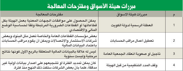 وبينت المصادر أن القرار المتخذ ربما يكون له أثر سلبي على الاستثمار المؤسسي بالنسبة إلى الصناديق والمحافظ الاستثمارية، سواء الأجنبية أو المحلية، الأمر الذي قد يزيد من حدة المضاربات على أثر أن تلك الفترة ستشهد نوعاً من الضبابية حول نتائج أعمال الشركات ومدى انعكاسها على البيانات المالية التي من المفترض أن تكون متاحة للجمهور عند لحظة اتخاذ القرار. وأشارت إلى أن مسؤولية هيئة الاسواق هي توفير اعلى درجات الشفافية، وكان الافضل ان تمد اجل الافصاح عن البيانات المالية اسابيع او شهراً إضافيا، بدلا من الغاء اصدار بيانات الربع الاول، مؤكدة أن مبررات القرار التي استندت إليها الهيئة، ومنها العطلة الرسمية، واهية ولا تتناسب مع قرار الموافقة على عودة التداول في البورصة يوم الأحد الماضي، خصوصا ان قطاعات اخرى مهمة في الدولة كالنفط والصحة والكهرباء تواصل اعمالها بشكل استثنائي، وهيئة اسواق المال يمكن ان تجد المخرج المناسب لمعالجة بطء اصدار النتائج المالية بدلا من الغائها أو ضمها مع نتائج الربع الثاني.وشددت المصادر على ان بعض مبررات الهيئة لا علاقة لها بالقرار، كمسألة صعوبة انعقاد الجمعيات العمومية للشركات المدرجة، لأن نتائج الربع الاول لا علاقة لها ببيانات نهاية العام، ولا تتطلب اكثر من اجتماع مجلس الادارة، لا الجمعية العمومية، كما أن وقف اعمال مراقبي الحسابات مؤقت أصلا، ويمكن لهم العمل، كما تم اعادة عمل العديد من جهات القطاع الخاص كالبنوك وشركات الاستثمار والاتصالات والبورصة، فضلاً عن أن وقف المدد التنظيمية يمكن أن يعطي الهيئة هامشا لتمديد اصدار البيانات المالية لفترة أطول لا إلغائها.