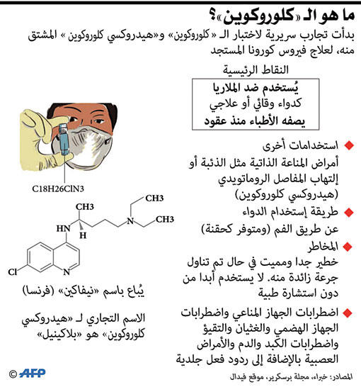 وقال كوجا للصحافيين، أمس الأول: "أحضرنا دواء خاصاً يستخدم في الصين يقال انه احدث تحسناً في حالة المرضى الذين يعالجون في وحدات الرعاية المركزة، ويخفض فترة علاجهم من 12 يوما إلى اربعة أيام".ولم يكشف معلومات عن الدواء، إلا أنه تم استخدام دواء الملاريا "كلوروكوين" أخيرا لمعالجة المصابين بفيروس كورونا في الصين وفرنسا.وأوضح كوجا أن 50 ألف مجموعة فحص سريع وصلت من الصين وبدأ استخدامها، ويتوقع وصول 300 ألف أخرى بحلول الغد.وفي باريس، وجّه خبراء الصحة العامة الفرنسيون ملاحظة تحذيرية بشأن استخدام عقار الـ "كلوروكوين" المضاد للملاريا ضد المرض الناجم عن "كورونا"، لكنهم قالوا إنه يمكن استخدامه للمرضى ذوي الحالات الخطيرة وفي ظل ظروف صارمة. وقال وزير الصحة الفرنسي أوليفييه فيران، إن المجلس الأعلى للصحة العامة في البلاد وافق على استخدام "هيدروكسي كلوروكوين" لعلاج المرضى ذوي الحالات الخطيرة في المستشفى، إذا وافق الأطباء هناك بشكل جماعي على أنه سيكون مناسبا. ويأتي القرار بعد يوم من إعلان فريق طبي في مستشفى بمرسيليا أنه سيعالج المرضى الذين يعانون الفيروس المميت بالعقار المضاد للملاريا إلى جانب المضاد الحيوي "أزيثروميسين". إلى ذلك، كشفت وزارة الاتصال (الإعلام) الجزائرية عن بروتوكول العلاج المسمى "الكلوروكوين" لأجل التصدي لـ "كورونا".وأكدت الوزارة، أن "الكلوروكوين هو جزيئة مضادة للملاريا، يستخدم في العلاج من هذا الوباء ومن أمراض الروماتيزم والذئبة"، مشيرة إلى أن "الدراسات في هذا الصدد انطلقت بالصين في فبراير 2020، ولا تزال مستمرة في أوروبا".وتابعت: "الكلوروكوين أعطى نتائج واعدة لمواجهة الفيروس من خلال زيادة القدرات المناعية للفرد. وهو منتج يصنع محليا وبكميات كافية لعلاج المرضى حسب البروتوكول الذي وضعه الخبراء".