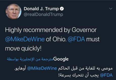 في تغريدة له عن "كورونا"، أخطأ الرئيس الأميركي دونالد ترامب بالإشارة إلى حساب كان يُفترض أن يتعلق بإدارة الغذاء والدواء المعروفة اختصاراً بـ(FDA)، لكنه بدلاً من ذلك أشار إلى شاب سعودي، يدعى "أبوالفدا"، وحسابه هو @FDA.وذكر موقع "سكاي نيوز" أمس أن أبوالفدا، يعرف بمقاطعه المتنوعة على حسابيه في "يوتيوب" و"سناب شات"، تحت اسم "سنابات أبوالفدا". وتتعلق تغريدة ترامب بطلبه من هيئة الغذاء والدواء المصادقة على معدات طبية اقترحها عمدة "أوهايو"... وبعد التغريدة، حظي أبوالفدا بآلاف المتابعات، وأصبح حديث السعوديين، وانهالت التعليقات الساخرة والسيناريوهات الافتراضية لإنقاذ الشاب السعودي للوضع في أميركا.