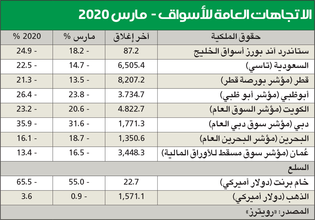 وتجاوباً مع قرار الفدرالي الأميركي، تحرك بنك الكويت المركزي بسرعة لمواجهة الأزمة الاقتصادية الحالية، وخفّض أسعار الخصم مرتين في هذا الشهر بمقدار 125 نقطة أساس. وقالت وكالة «فيتش» للتصنيفات الائتمانية، إن البنوك الكويتية في وضع أفضل من معظم نظرائها في دول الخليج من حيث مواجهة الضغوط في الأزمة الاقتصادية الحالية. وبالرغم من ذلك، وإلى جانب تخفيض أسعار الخصم والإجراءات الاحترازية، مثل تأجيل سداد القروض، التي من المتوقع أن تؤثر على ربحية القطاع، فقد تراجع مؤشر القطاع المصرفي بنسبة 23.0 في المئة لهذا الشهر. وفي حين سجل قطاع المواد الاستهلاكية أفضل أداء بارتفاع نسبته 2.2 في المئة، سجل قطاع الخدمات الاستهلاكية أسوأ أداء بتراجع نسبته 28.0 في المئة. وعلى الصعيد الإقليمي، أشار تقرير «المركز» إلى أن مؤشر ستاندرد آند بورز المُركّب لدول مجلس التعاون الخليجي قد تراجع بنسبة 18.2 في المئة لهذا الشهر، في ظل إعلان جميع الأسواق عن تكبد خسائر. وفي ظل تأثر الأعمال عبر القطاعات بتفشي كورونا، إلا أن انهيار أسعار النفط نجم عنه مزيد من الانخفاض في أسعار الأسهم. وسجلت دبي أكبر خسارة بتراجع نسبته 31.6 في المئة. في حين أنهت السعودية تعاملات هذا الشهر مسجلة تراجع بنسبة 14.7 في المئة. أما قطر، فكانت الأقل تراجعًا مسجلة خسائر بنسبة 13.5 في المئة. كما أكدت «ستاندرد آند بورز» تصنيفها الائتماني السيادي الحالي للسعودية وقطر، عند - A و- AA على التوالي، مشيرة إلى احتياطياتهما المالية القوية. بينما أعلنت الإمارات والسعودية وقطر حوافز مالية ونقدية خلال الشهر، والتي بدورها ساعدت الأسواق في الحد من الخسائر. وتجاوباً مع قرار الفدرالي الأميركي، خفضت البنوك المركزية بدول من مجلس التعاون الخليجي أسعار الفائدة أيضاً. كما أشار تقرير «المركز» إلى أن شركة الاتصالات السعودية حققت مكاسب بنسبة 5.9 في المئة. بينما تراجع بنك الإمارات دبي الوطني بنسبة 42.4 في المئة. وقد اتخذ البنك إجراءات احترازية مثل تأجيل سداد القروض لمساعدة المقترضين. وتراجع أداء أسواق الأسهم العالمية مع انخفاض مؤشر MSCI العالمي بنسبة 13.5 في المئة خلال الشهر. وتراجعت الأسهم الأميركية (إس اند بي 500) بنسبة 12.5 في المئة في مارس. كما خفض مجلس الاحتياطي الفدرالي سعر الفائدة مرتين في هذا الشهر إلى ما يقارب الصفر، وأعلن خطة التيسير الكمي وغيرها من الإجراءات لتوفير السيولة والتدفقات الائتمانية للأسر. وتم تفسير الإجراء القوي الذي اتخذه الاحتياطي الفدرالي على أنه يشير إلى نظرة مستقبلية سلبية، مما دفع الأسواق نحو التراجع. وأقرت الولايات المتحدة حزمة تحفيزية بقيمة 2 تريليون دولار لدعم اقتصادها، وأغلق سوق المملكة المتحدة (مؤشر فوتسي 100) على انخفاض بنسبة 13.8 في المئة خلال شهر مارس. كما خفضت المملكة المتحدة أسعار الفائدة، ودشنت خطة التسير الكمي وتعهدت بتقديم حوافز مالية. كما أنهت الأسواق الناشئة تعاملاتها لهذا الشهر بمؤشرات سلبية، حيث سجل مؤشر MSCI للأسواق الناشئة خسائر شهرية بنسبة 15.6 في المئة. وفي الصين، انخفض مؤشر شنغهاي - أ بنسبة 4.5 في المئة فقط، مدعومًا بالتباطؤ في تفشي الفيروس، واستئناف أنشطة المصانع وتحفيز السياسة النقدية.وأغلقت أسعار النفط عند حاجز 22.7 دولارا أميركيا للبرميل في نهاية مارس 2020، مسجلة تراجعا بنسبة 55 في المئة عن فبراير 2020. وفي وقت سابق من هذا الشهر، توقفت المحادثات بين حلفاء «أوبك+» في ظل رفض روسيا الموافقة على خفض إضافي لإنتاج النفط. وفي تحرك سريع وقوي، ردت السعودية بخفض أسعار النفط لديها لبعض عملائها، وأعلنت خططا لزيادة انتاجها النفطي بمقدار 2 مليون برميل يوميًا. وعلى الرغم من ضعف الطلب بسبب كورونا، فإن هذه التطورات دفعت أسعار النفط لأدنى مستوياتها. ونظرًا لأن تدني أسعار النفط سيؤثر أيضًا على منتجي النفط الصخري، فإن الولايات المتحدة تبذل جهودًا لإنهاء حرب أسعار النفط. وانخفض الذهب بشكل هامشي بمقدار 0.9 في المئة خلال الشهر. وكان شهرًا مليئًا بالتقلب