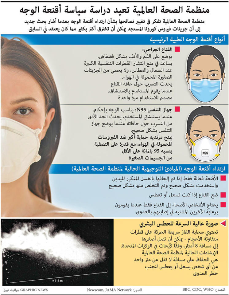 وتحدث مدير معهد الأمراض المعدية أنتوني فوتشي، العضو في فريق عمل البيت الأبيض حول "كورونا" الذي يجتمع ساعة يومياً مع ترامب، لقناة "فوكس نيوز" الإخبارية، عن معطيات تشير إلى أن "الفيروس يمكنه في الواقع الانتقال بين الأشخاص الذين يقومون بمجرد التحدث وليس فقط حين يسعلون أو يعطسون".وتوفر المعطيات التي تشير إلى انتقال الفيروس هوائياً تفسيراً طال البحث عنه لقدرة الفيروس على الانتشار بسرعة، في وقت يبدو أن الأشخاص المصابين لكن من دون عوارض والذين يشكلون ربما ربع إجمالي المصابين، مسؤولون عن نقل العدوى إلى جزء كبير من المصابين دون علمهم بذلك.وذكرت الأكاديمية الأميركية للعلوم في رسالة موجهة للبيت الأبيض، 4 دراسات تميل إلى أن الفيروس ينتقل عبر الهواء الصادر عن تنفس الأفراد وليس فقط عبر القطرات الناتجة عن السعال أو العطس قرب أحدهم أو التي تعلق على الأسطح إذ يمكن للفيروس أن يبقى حياً ساعات وأياماً حسب المادة المكون منها هذا السطح.ووجد باحثون في "جامعة هونغ كونغ"، أخيراً أن ارتداء القناع يقلص كمية الفيروس الصادرة من زفير المرضى.وترى الدول الآسيوية التي تنتج عدداً هائلاً من الأقنعة الطبية، أن تأخر الدول الغربية في هذا المجال يدل على خلل. لكن الجهات المعنية بدأت في تغيير موقفها من حيث ارتداء القناع منذ أيام تحت ضغط الرأي العام الذي يتساءل لماذا تحمي الأقنعة فقط الممرضين لكن لا يمكنها حماية المواطنين العاديين من الوباء؟وفي فرنسا، أوصت أكاديمية الطب أمس الأول، بالارتداء الإلزامي للقناع باعتباره "إضافة منطقية لإجراءات التصدي" للمرض.«الصحة العالمية»