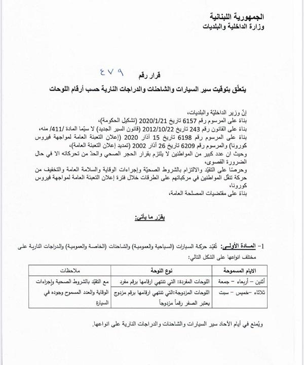 لبنان يعتمد أيام سير «مفردة ومزدوجة» للسيارات