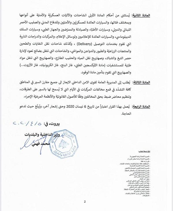 ويبقى العائدون في الفنادق الى حين ظهور نتائج الفحوص التي تم نقلها من المطار، ثم فرز كل حالة على حدة، استنادا الى نتائج الفحوص.وتمت المرحلة الأولى من عودة المغتربين بطريقة سلسلة وسط إجراءات وترتيبات من الاجهزة المعنية في المطار، واستنادا الى الفحوص الأولية التي أجراها الفريق الطبي لم تسجل أي حالة عليها أعراض صحية. وقال وزير الصحة محمد حسن بعد وصول الدفعة الأولى: "كل الارشادات الموضوعة نُفذت، وقمنا بجهد جبار، وما قامت به وزارة الصحة يعد نموذجاً يحتذى به". وأضاف حسن: "بعد 6 ساعات تصدر نتائج فحوصات الـPCR للمغتربين العائدين من السعودية، وعلى ضوء النتائج تتخذ الاجراءات بحقهم".إلى ذلك، وفي إطار التشدد لضبط مخالفات «التعبئة العامة» وبعد توعد رئيس الحكومة اللبنانيين بـ «إجراءات مزعجة» وبزيادة ساعات منع التجول، قلّص وزير الداخلية محمد فهمي في مذكرة جديدة أمس، من حرية حركة المواطنين عبر تحديد أيام معينة للتنقل خلال الأسبوع، وفق أرقام السيارات. فخصص أيام الاثنين والأربعاء والجمعة للسيارات التي تنتهي بأرقام مفردة، أما الثلاثاء والخميس والسبت فستكون للتي تنتهي بأرقام مزدوجة، ومن ضمنها الصفر. ويمنع يوم الأحد سير كل السيارات والآليات والدراجات النارية.