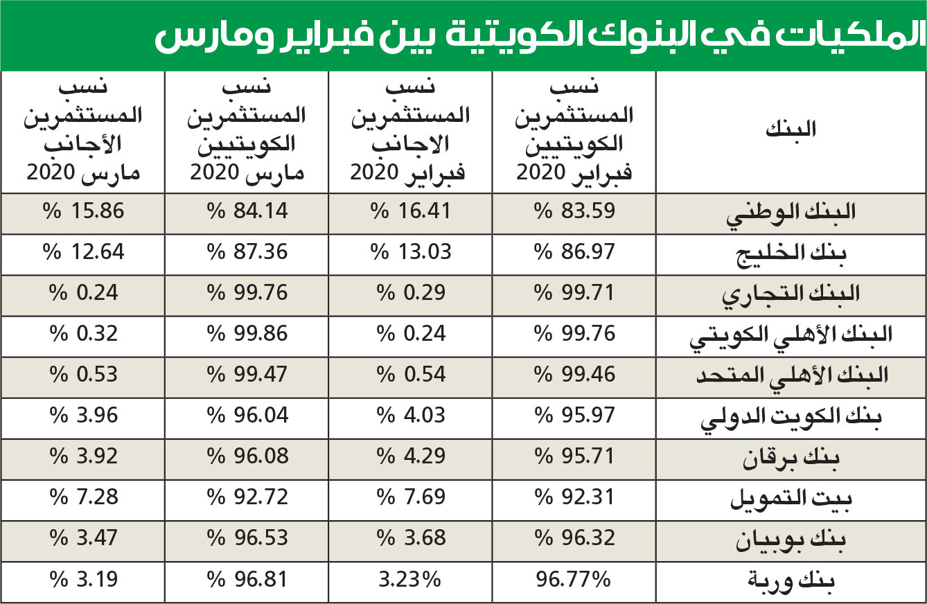 شهدت الملكيات الرئيسية في البنوك الكويتية، خصوصا حصص المستثمرين الاجانب، تراجعا طفيفا مع نهاية شهري فبراير ومارس الماضيين، رغم العاصفة التي خلفتها تداعيات أزمة "كورونا"، ما يعني أن هناك قناعة بسلامة الاستثمار في البنوك الكويتية ومستقبلها. وشهدت بعض الأسهم زيادة طفيفة من المستثمرين المحليين، مقابل استقرار لافت للأجانب، وتغير طفيف جدا لا يذكر، حيث لم يتجاوز التغير في حصص المستثمرين الأجانب 1 في المئة بل أقل بكثير. فعلى صعيد البنك الوطني، يمكن الاشارة إلى أن حصص المستثمرين الاجانب بنسبة (0.55- % )، في حين تراجعت ملكيتهم في بنك الخليج 0.39 في المئة، وفي "التجاري" انخفضت ملكيتهم بنسبة 0.05 في المئة، أما بالبنك الأهلي الكويتي فقد ارتفعت ملكية المستثمرين الأجانب بنسبة 0.08 في المئة، وفي "الأهلي المتحد" تراجع حصتهم (0.01- %).