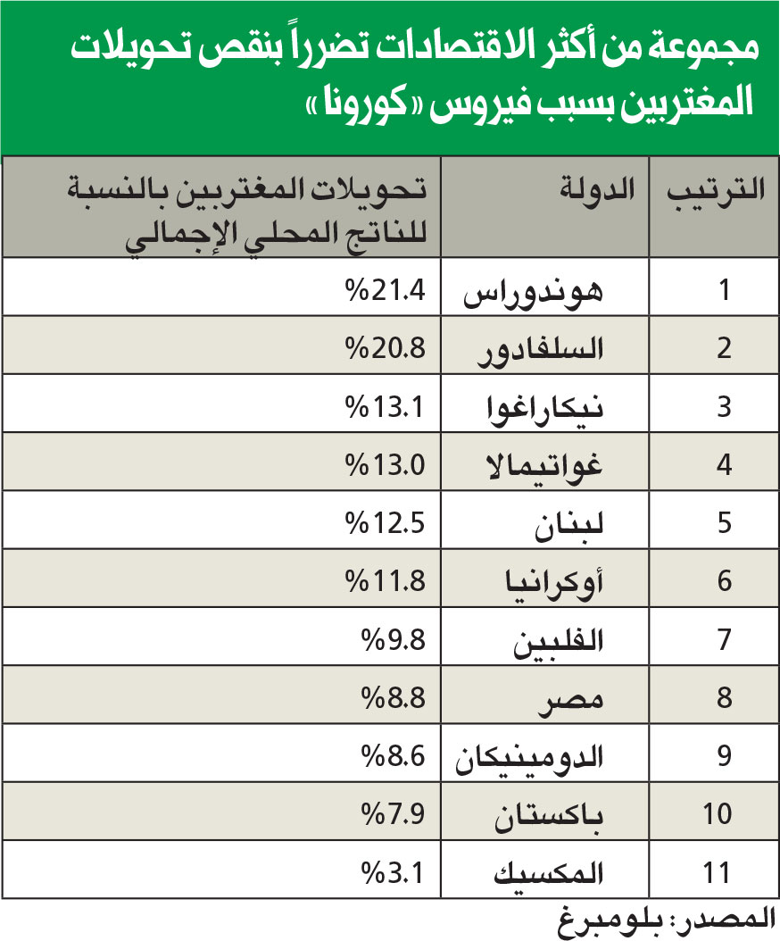 يأتي ذلك في الوقت الذي تعاني اقتصادات ناشئة، مثل: لبنان وأوكرانيا والفلبين من «كورونا»، وسط توقعات بأن تكون الدول الثلاث الأكثر تضرراً.وتوقعت منظمة العمل الدولية تسبب أزمة «كورونا» في تسريح 6.7 في المئة من العمالة عالمياً خلال الربع السنوي الثاني من العام الحالي، كما أن أكثر من مليار عامل عُرضة لتقليص رواتبهم أو فقدان وظائفهم. مجموعة من أكثر الاقتصادات تضرراً بنقص تحويلات المغتربين بسبب فيروس كورونا.