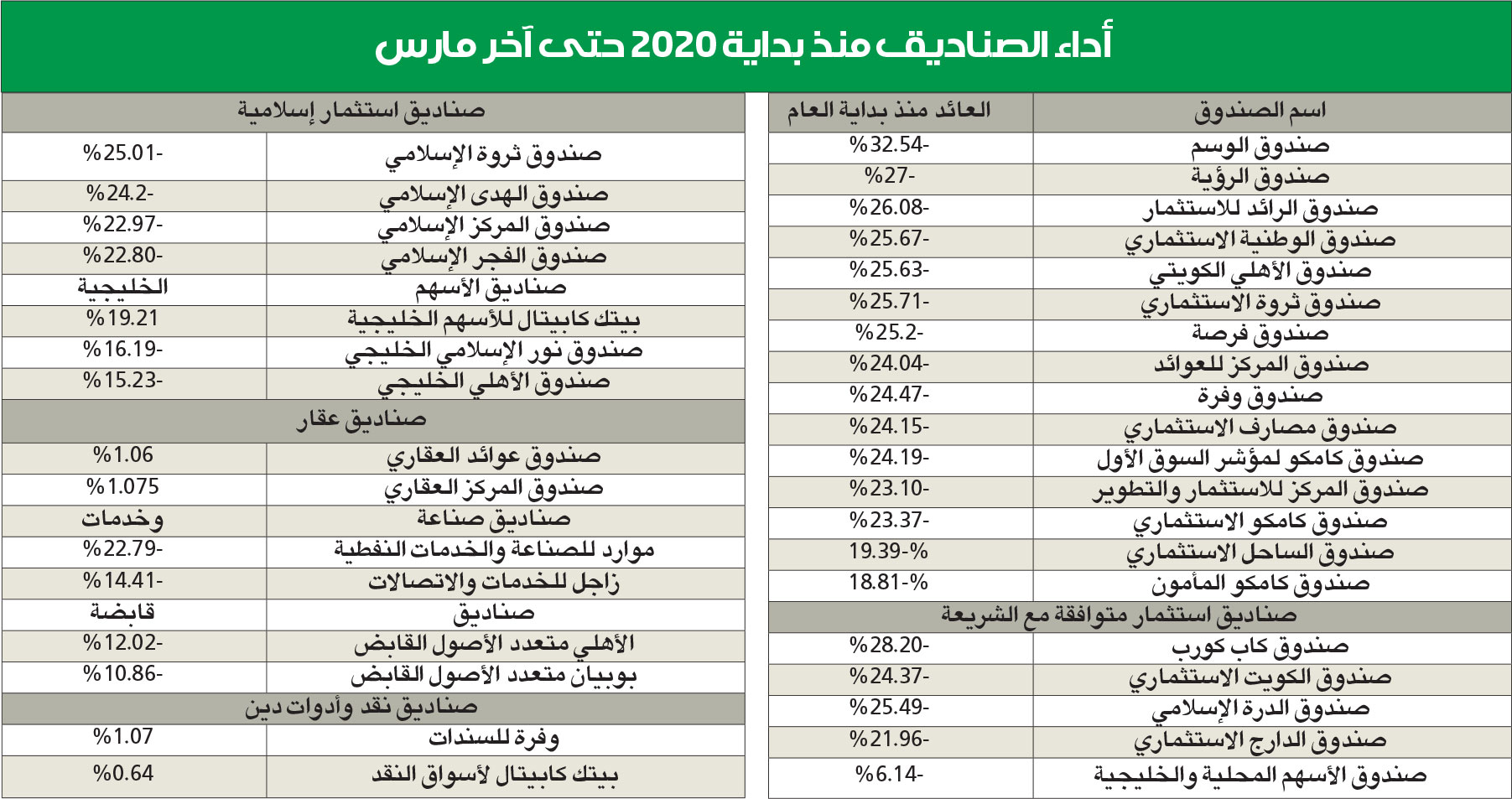 رصدت "الجريدة" أداء الصناديق الاستثمارية منذ بداية العام وحتى نهاية مارس، ويمكن القول إن فيروس كورونا أصاب أداء الصناديق كافة في البورصة الكويتية وأسواق الخليج، حيث كانت أغلب الخسائر مركّزة بشكل كبير في شهر مارس.وأكدت مصادر استثمارية أن خسائر الصناديق السوقية تبقى دفترية، حيث إن الصناديق لمستثمرين طويلي الأجل ولديهم نفَس طويل، فضلا عن أن أغلبية استثمارات الصناديق مركّزة في أسهم ممتازة قد تتأثر نسبيا بتوقّف الأعمال القسري والظروف العالمية، إلا أنها ستكون من أوائل المرتدّين بقوة نحو الصعود بعد استقرار التداعيات التي خلّفتها الأزمة الصحية. وأشارت المصادر الى أنه بالرغم من التأثيرات العالمية الكبيرة على معظم الاقتصادات الناشئة نتيجة ضعف الطلب على النفط وقلة الاستهلاك نتيجة التباطؤ التشغيلي في كثير من القطاعات المنتجة، وخصوصا بعض الصناعات، فإن الحزم المالية الضخمة بمئات المليارات من الدولارات سيكون لها دور إيجابي في تحقيق توازن نسبي ثم استقرار وأداء مقبول، لا سيما أنه ليس من مصلحة أحد اختناق الاقتصاد، فضلا عن أن البنوك المركزية مستنفرة لوضع أفضل الحلول التي تضمن انتعاش الاقتصاد، واستمرار وصول الأكسجين إلى الوحدات الفاعلة.