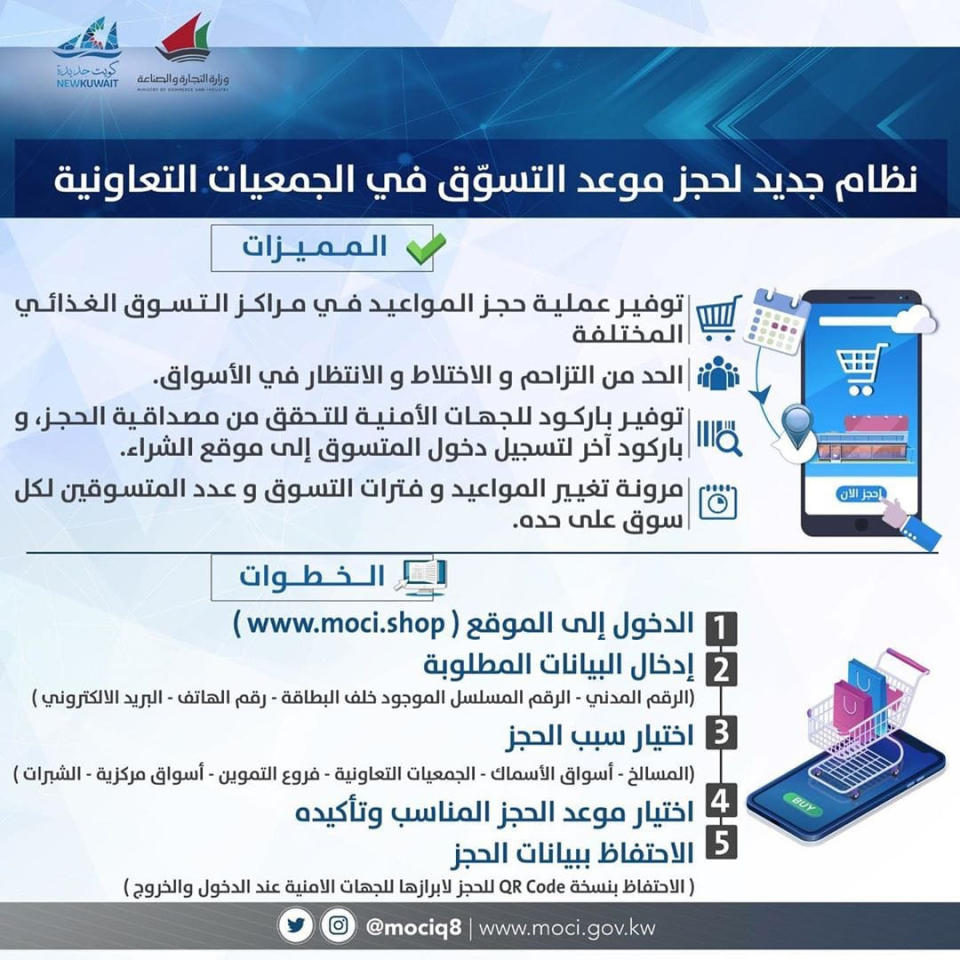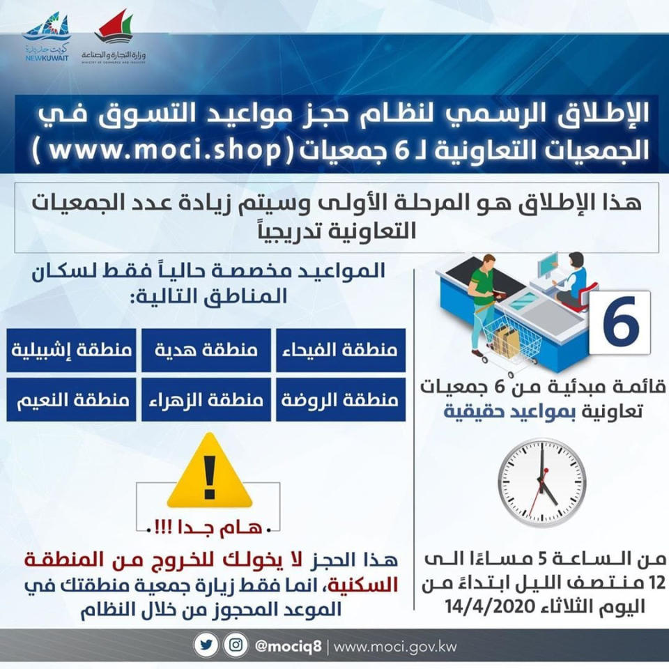 ضمن الإجراءات الحكومية لمواجهة تفشي وباء «كورونا»، أعلنت وزارة التجارة والصناعة، أمس، إطلاق نظام حجز مواعيد التسوق في الجمعيات التعاونية، وخصصت ذلك لست مناطق هي الفيحاء والروضة والزهراء وهدية وإشبيلية والنعيم، على أن تتم إضافة المناطق الأخرى تدريجياً.وقالت الوزارة، في بيان أمس، إن هذا الإطلاق يعد المرحلة الأولى من نظام حجز المواعيد، لافتة إلى أنه تم إيقاف النظام الإلكتروني التجريبي للحجز بـ «التعاونيات» وإلغاء كل المواعيد التجريبية التي حُجِزت سابقاً، نظراً لتطوير النظام بناءً على ملاحظات المواطنين والمقيمين.وذكرت أن بدء المرحلة الأولى سيكون من خلال الجمعيات التي ستقوم بتشغيل نظام المواعيد ابتداءً من الساعة 5 مساء إلى 12 منتصف الليل، وذلك بداية من أمس.
