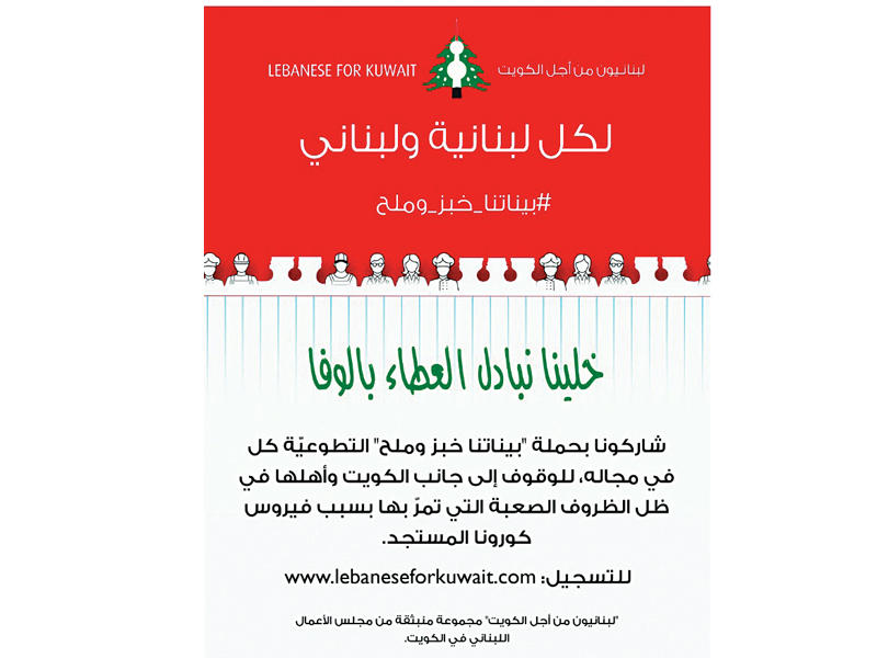 أطلقت مجموعة "لبنانيون من أجل الكويت"، المنبثقة من مجلس الأعمال اللبناني في الكويت، مبادرة وفاء تجاه الكويت وشعبها، في ظل الظروف التي تشهدها البلاد بسبب فيروس كورونا.وبدأت المبادرة، التي سميت "بيناتنا خبز وملح"، بدعم من السفارة اللبنانية في الكويت، عبر إنشاء موقع إلكتروني جديد موجه لأبناء الجالية اللبنانية في الكويت، لحثهم على المشاركة بكثافة من أجل التطوع، ووضع خبراتهم كل بمجاله في تصرف الدولة الكويتية كعربون وفاء وتقدير لما قدمته الكويت لهم من خير وأمان عندما احتضنتهم في غربتهم.