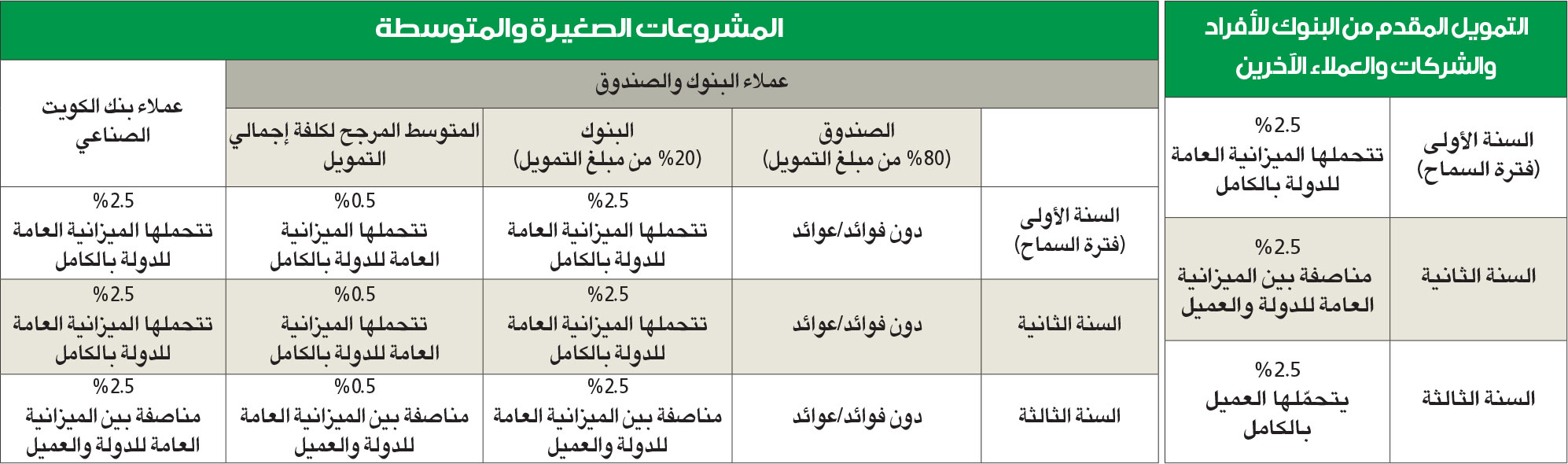 يأتي دور البنوك الكويتية في التعاون مع الصندوق لتقديم التمويل لهذه الشريحة انطلاقاً مما يتوافر لديها من خبرات مصرفية، وكوادر بشرية مؤهلة قادرة على القيام بالدراسات الائتمانية بكفاءة عالية، إضافة إلى ما يتوافر لدى البنوك من منافذ عديدة تمكنها من تلقي الطلبات وإنجاز تلك الدراسات بالسرعة المنشودة. ونظراً إلى أن نظام الصندوق وفقا لقانون إنشائه يغطي فقط نسبة 80 في المئة من التمويل، ولا يغطي كامل المبالغ التي تحتاجها هذه المشروعات للاستمرار، فإن البنوك تشارك في تقديم التمويل بالمبلغ المتبقي، وتتحمل في ذات الوقت مسؤولية إدارة المديونيات وكامل المخاطر الائتمانية للجزء الممول منها. فضلًا عن ذلك، تحتفظ البنوك بحسابات العملاء، مما يسهل عليها متابعة صرف التمويل في الأوجه المحددة له وبالتالي يوسع الأثر الإيجابي للتمويل. وفيما يلي بيان لحالات التمويل لشريحة العملاء الذين ينطبق عليهم تعريف المشروعات الصغيرة والمتوسطة ولديهم مشروع اقتصادي يعمل بكفاءة قبل الأزمة وتأثرت تدفقاته النقدية بسببها.أولاً: عملاء البنوك والصندوق، والمشروعات غير الحاصلة على تمويل من أي جهة:وهم العملاء الحاصلون على تمويل من البنوك أو الصندوق، أو من كليهما، وكذلك العملاء غير الحاصلين على تمويل من أي جهة كانت، وينظر في طلباتهم وفق الآتي:1) يقدم العميل المتضرر طلب التمويل إلى البنك الذي يحتفظ بحسابه الرئيسي، وذلك عبر بوابة إلكترونية يخصصها البنك لهذا الغرض. ويتولى البنك التنسيق مع الصندوق لدراسة الطلب.2) يقوم البنك بإعداد الدراسة الائتمانية اللازمة بشكل متكامل وسريع بحيث تشمل على الأقل: التحقق من استيفاء العميل لشروط منح التمويل، ومراجعة تدفقاته النقدية السابقة للتحقق منها، والاستعلام عنه من خلال شركة شبكة المعلومات الائتمانية (Ci-Net).3) في ضوء ما تسفر عنه الدراسة الائتمانية، يتخذ البنك القرار المناسب ويحدد حجم التمويل اللازم.4) يكون التمويل المقدم مشتركًا بين الصندوق والبنك، بنسبة 80 في المئة للصندوق و20 في المئة للبنك، من خلال عقد ثلاثي الأطراف.5) يلتزم الصندوق بدفع حصته في التمويل للبنك المانح خلال يومين من تاريخ إخطار البنك له.6) في حال بلوغ العميل المتضرر الحد الأقصى المسموح للصندوق بتمويله لكل عميل (400 ألف دينار)، فيمكن تقديم مبلغ التمويل كاملًا من البنك.ثانياً: عملاء محفظة المشروعات الصغيرة والمتوسطة المدارة من قبل بنك الكويت الصناعي:1) يتقدم العميل المتضرر لبنك الكويت الصناعي بطلب الحصول على التمويل.2) يعد بنك الكويت الصناعي الدراسة الائتمانية اللازمة بشكل متكامل وسريع، حيث تشمل على الأقل: التحقق من استيفاء العميل لشروط منح التمويل، ومراجعة تدفقاته النقدية السابقة للتحقق منها، والاستعلام عنه من خلال شركة شبكة المعلومات الائتمانية (Ci-Net).3) في ضوء ما تسفر عنه الدراسة الائتمانية، يتخذ بنك الكويت الصناعي القرار المناسب ويحدد حجم التمويل اللازم.للأفراد والشركات والعملاء الآخرين