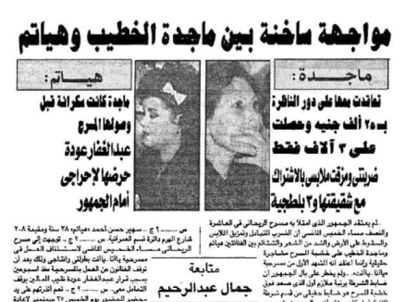 على أي حال، يبدو أن حالها مع النجومية قد تأثر نسبيا بعد مغادرتها أسوار السجن، فبعد أن عادت إلى عالم الفن، كانت تلك العودة لا تليق بها، فقدمت أدوارا ثانوية في مسلسلات تلفزيونية وأفلام سينمائية لا تناسب حجم موهبتها، حتى عملت في مسرحية "يا أنا يا أنت"، إنتاج وبطولة الفنانة الاستعراضية والممثلة هياتم، وهي المسرحية التي فشلت فشلاً ذريعاً، وأدت إلى اندلاع خلافات مادية جعلت هياتم تعتدي على ماجدة بالضرب، على خشبة مسرح الريحاني في 25 سبتمبر 1997.وأثارت تلك الواقعة جدلاً كبيراً في ذلك الوقت، وبرّرت هياتم فعلتها بأنها لم تحصل على أجرها عن أدائها في المسرحية، لكن الجمهور تعاطف مع ماجدة الخطيب التي تعرضت للعديد من الكدمات في الوجه وأجزاء متفرقة في الجسد، علاوة على كسر في أحد ساقيها!وأصدرت محكمة جنح الأزبكية حكما بالحبس لمدة شهر لكل منهما، فلم يجد طرفا الخصومة أمامهما سوى التصالح لتجنب عقوبة السجن، وبالفعل تصالحت هياتم وماجدة أمام محكمة مستأنف الأزبكية ليسدل الستار على اتهاماتهما المتبادلة على صفحات الجرائد على مدى ثلاث سنوات.زائر الفجر