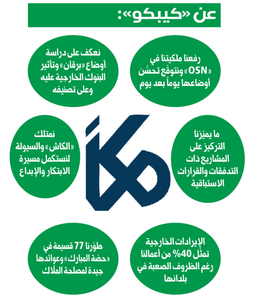 ● ماذا عن توقعاتك لنمو إيرادات المجموعة في ظل الأزمة الراهنة؟-كنا قبل الأزمة نتوقع عوائد تصل إلى 12 في المئة مع نهاية العام الجاري،والآن تصعب عملية التقييم ونعكف على إعادة النظر فيه.● هل سيؤثر تخفيض التصنيف على قدرة»كيبكو»؟-الحمد لله أوضاعنا جيدة، وهناك إعادة في تصنيف العديد من المؤسسات، حتى الدول تأثرت بالأوضاع الراهنة وانخفض تصنيفها، وانخفاض التصنيف يمكن أن يؤثر على التمويل في حال الحاجة إليه، إذ يمكن زيادة كلفة الاقتراض، ولكننا لسنا بحاجة إليه في الوقت الراهن.