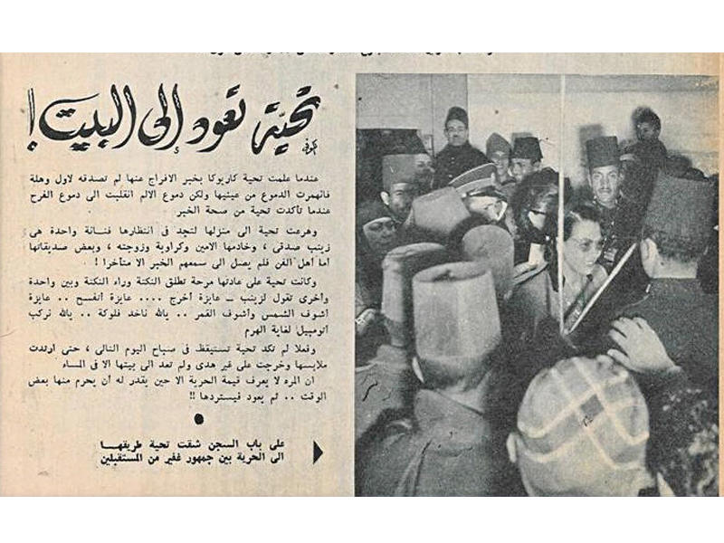 تتابعت ومضات آلات التصوير على وجه كاريوكا بعد الإفراج عنها، وصدر العدد 133 من مجلة "الكواكب" بتاريخ 16 فبراير 1954 يحوي ملفاً مصوراً تحت عنوان "تحية تعود إلى البيت"، وظهر محرر المجلة برفقة الفنانة فور خروجها مباشرة من السجن ورحلتها حتى الوصول إلى بيتها، وماذا فعلت في أول يوم بعد البراءة ومن الذى كان في استقبالها.وكتبت المجلة أن كاريوكا لم تصدق خبر الإفراج عنها لأول وهلة فانهمرت الدموع من عينيها، لكنها تحولت إلى دموع فرح عندما تأكدت من صحة الخبر، وهرعت إلى منزلها لتجد في انتظارها فنانة وحيدة هي زينب صدقي، وخادمها الأمين وكراوية (الطبال الخاص بها) وزوجته وبعض صديقاتها، أما أهل الفن فلم يصل إلى سمعهم الخبر إلا متأخراً. وكانت كاريوكا على عادتها مرحة تطلق النكتة وراء النكتة وبين واحدة وأخرى تقول لزينب: "عايزة أخرج، عايزة أتفسح، يللا ناخد فلوكة (مركب صغير)، يللا نركب أتومبيل (سيارة) لغاية الهرم"، وفعلاً لم تكد تحية تستيقظ في صباح اليوم التالي حتى ارتدت ملابسها وخرجت على غير هدى ولم تعد لبيتها إلا في المساء.الطريق إلى الحرية