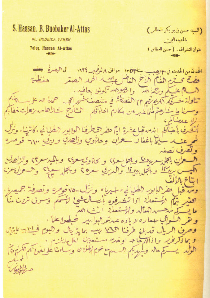 إحدى الوثائق تتحدث عن تجارة الصقر في اليمن من وكيله حسن بن أبوبكر العطاس وعن أخبار بيع التمور وأسعارها وأسعار الريال الفرنسي مقابل الروبية الهندية