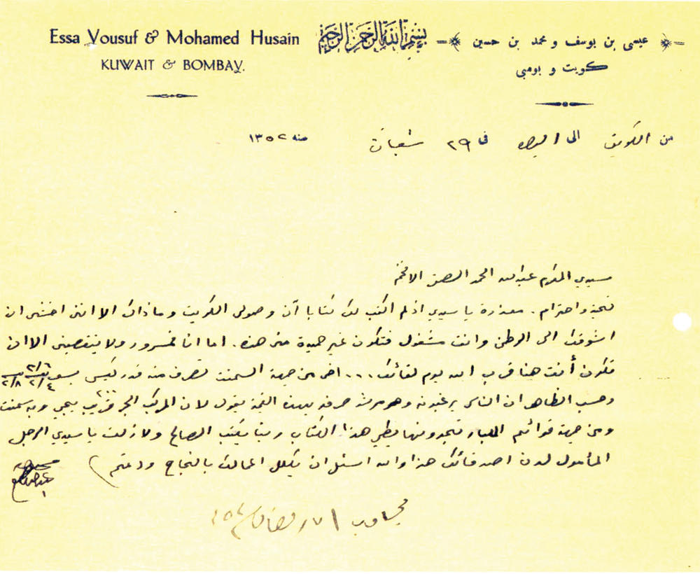في 29 جمادى الآخرة 1352 الموافق 18 أكتوبر 1933مجناب الأجلاء الكرام عبدالله الحمد الصقر وإخوانه المحترمين،بعد السلام عليكم ورحمة الله وبركاته، مع هذا كتاب بتاريخ الأمس فيه ما يغني عن الإعادة.الأخ عبدالعزيز وصل بالسلامة. علي الإبراهيم الجوعان كما ذكرنا إذا وافق معكم من جهة بومه الصغير بنولون نهايته 10 /11 آنة إلى كراجي وكاتيوار، وإذا ما وافق بالخصم بموجب خشب أهل الكويت المنولين البرانية وعلى شرط القرضة 200-300 روبية لا زيادة، ولا يسلم له بالهند شيء. جل القصد استحصال طلبنا منه وإذا وافق معكم بهذه الصورة لا يتعطل البوم، يكون يسافر بوقته، وإذا هو أمر على تنويل البومين راجعونا تلغرافياً مع مقدار القرضة التي يريدها، وأفيدونا بالجواب سريعاً.بوم ولد غيث والمباركي أو القضيبي إذا يوافقون بالتنول إلى كراجي وكاتيوار في عشرة آنات راجعونا تلغرافياً. هذا ما يلزم سلامنا كافة، ومنا يسلمون ودمتم.(توقيع عبدالله الحمد الصقر) من خصوص الأقراض (الأغراض/ الحاجيات) التي أوصيناكم عليها مالت الماجلة أوصوا جاسم يسلمها إلى ابن مشعل أو غيره من الخشب المتوجهين للهند، خصوصاً إذا حصل محمل رايح كاتيوار لا يبقيها عنده حتى تتعطل.من خصوص درباس العمر، وافقنا على تنويله بشرط أن يكون نوله بموجب أهل الكويت البرانية والمذكور بلغوه يتوجه إذا وافق. لأن البوم متعطل، أفيدونا بالجواب سريعاً".المتاجرة في البحرين وقطر والقطيف ودبي