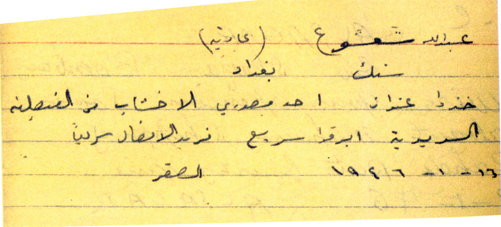 مسودة برقية مرسلة من عبدالله شعشوع في بغداد 1946