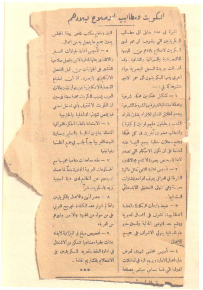 مقالة منشورة في جريدة الزمان العراقية الصادرة في بغداد بتاريخ 11 ابريل 1938م. احتفظ بها الوكيل السياسي البريطاني في الكويت، ويرى المترجم ان الفقرات 6 و7 و8 و9، هي من وضع العراقيين لا الكويتيين.