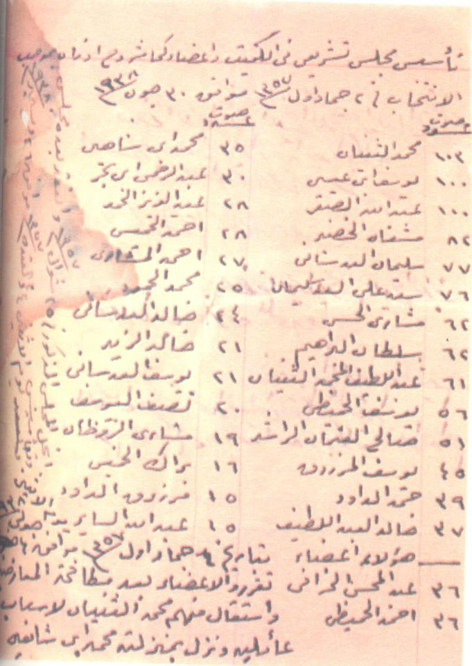 وثيقة نادرة من وثائق أسرة الخالد توضح قائمة النواب الناجحين والاحتياطيين لمجلس الأمة التشريعي مؤرخة بـ 30 يونيو 1938م.