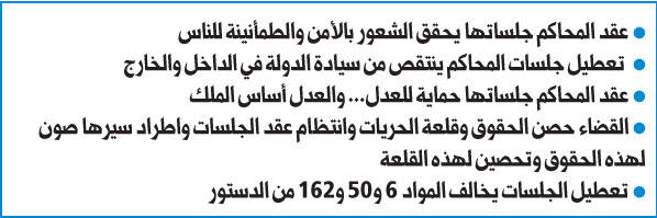وهي مقولة لسيدنا عمر بن الخطاب، رضي الله عنه، وقد جسّدها الدستور فيما نصت عليه المادة 162 من أن العدل أساس الملك وضمان للحقوق والحريات.وآية ذلك أن كل ما ينص عليه الدستور من حقوق وحريات يصبح حرثًا في البحر وتنكبًا لآمال هذه الأمة وأحلامها وطموحاتها، وإذا عطل القضاء عن ممارسة ولايته. نعم فالقضاء ميزان العدل، وبالعدل وحده تصان القيم وتسمو المبادئ والأخلاق، وتستقر الطمأنينة في النفوس، ويشعر كل مواطن بالانتماء لوطن يذود فيه القضاء عن كرامة الإنسان وحرياته وحقوقه.كما أن المُلك لا يتجزأ، فإن العدل لا يتجزأ، فالدولة تظلّ قائمة تبسط سيادتها على أرضها وعلى أبنائها والمقيمين فيها، في الحرب والسّلم على السواء.وفي هذا السياق، يذكر أنه في نهاية الحرب العالمية جمع تشرشل الوزراء ليسألهم الواحد تلو الآخر عن أحوال البلاد، بعد أن دكّت طائرات المحور المدن البريطانية، وشمل الدمار المدارس والمستشفيات والمصانع وكل مرافق الدولة، فأجابه كل الوزراء بأن الأمور في الحضيض، وأنهم سيبدأون من الصفر، عدا وزير العدل الذي قال له: القضاء بخير، فبريطانيا بخير.سادسا– دوام عقد الجلسات وانتظامها