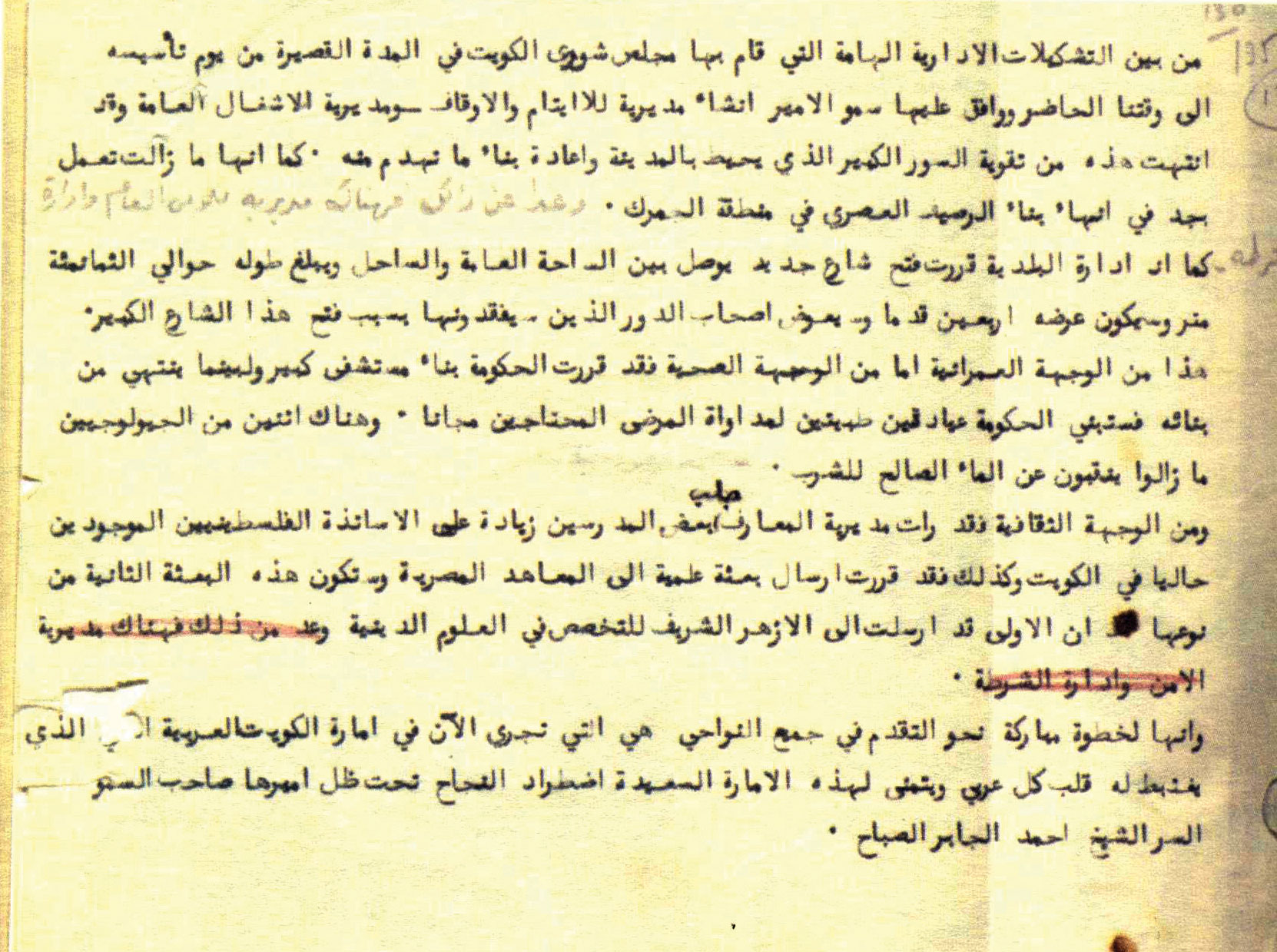ورقة من ضمن ملف الوثائق البريطانية تخص الإنجازات التي قام بها مجلس الشورى الذي عين أعضاءه الشيخ أحمد الجابر بعد حله المجلس التشريعي في مارس 1939م.