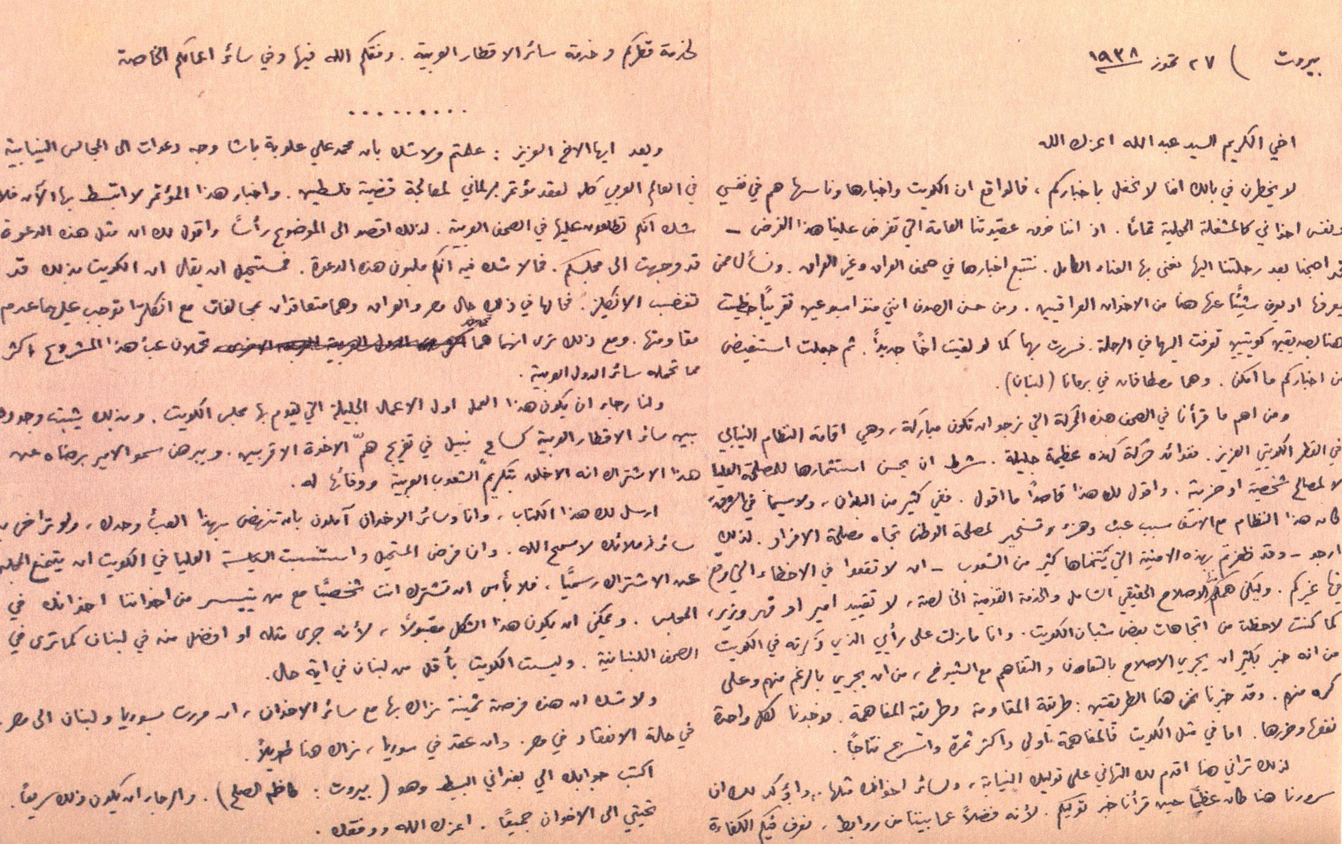 رسالة من كاظم الصلح في بيروت إلى عبدالله الصقر في الكويت بتاريخ 27 يوليو 1938م