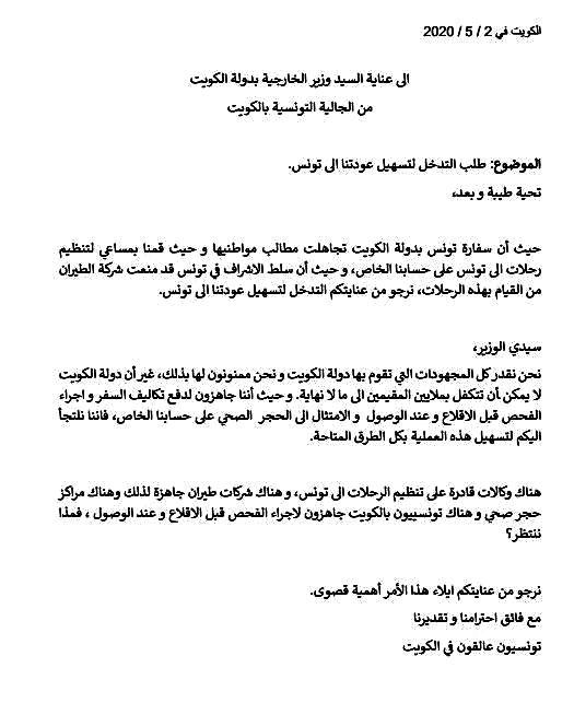 وفي موازة تجاهل السلطات التونسية لمطالبهم، لجأ التونسيون العالقون إلى مناشدة السلطات الكويتية التدخل لتسهيل عودتهم الى بلادهم، وقالوا في كتاب موجه الى وزير الخارجية، ان سفارة بلادهم لدى الكويت تجاهلت مطالب مواطنيها رغم المساعي لتنظيم رحلات إلى تونس ومنعت شركة الطيران من القيام بهذه الرحلات.وأضافوا "نحن نقدر كل الجهود التي تقوم بها دولة الكويت، ونحن ممنونون لها بذلك، غير أنها لا يمكن أن تتكفل بملايين المقيمين إلى ما لا نهاية، وحيث اننا جاهزون لدفع تكاليف السفر وإجراء الفحص قبل الاقلاع وعند الوصول والامتثال للحجر الصحي على حسابنا الخاص، فإننا نلجأ إليكم لتسهيل هذه العملية بكل الطرق المتاحة".وختموا بالقول: "هناك وكالات قادرة على تنظيم الرحلات الى تونس، وهناك شركات طيران جاهزة لذلك، وهناك مراكز حجر صحي، وهناك تونسيون بالكويت جاهزون لإجراء الفحص قبل الاقلاع وعند الوصول، فماذا ننتظر؟".