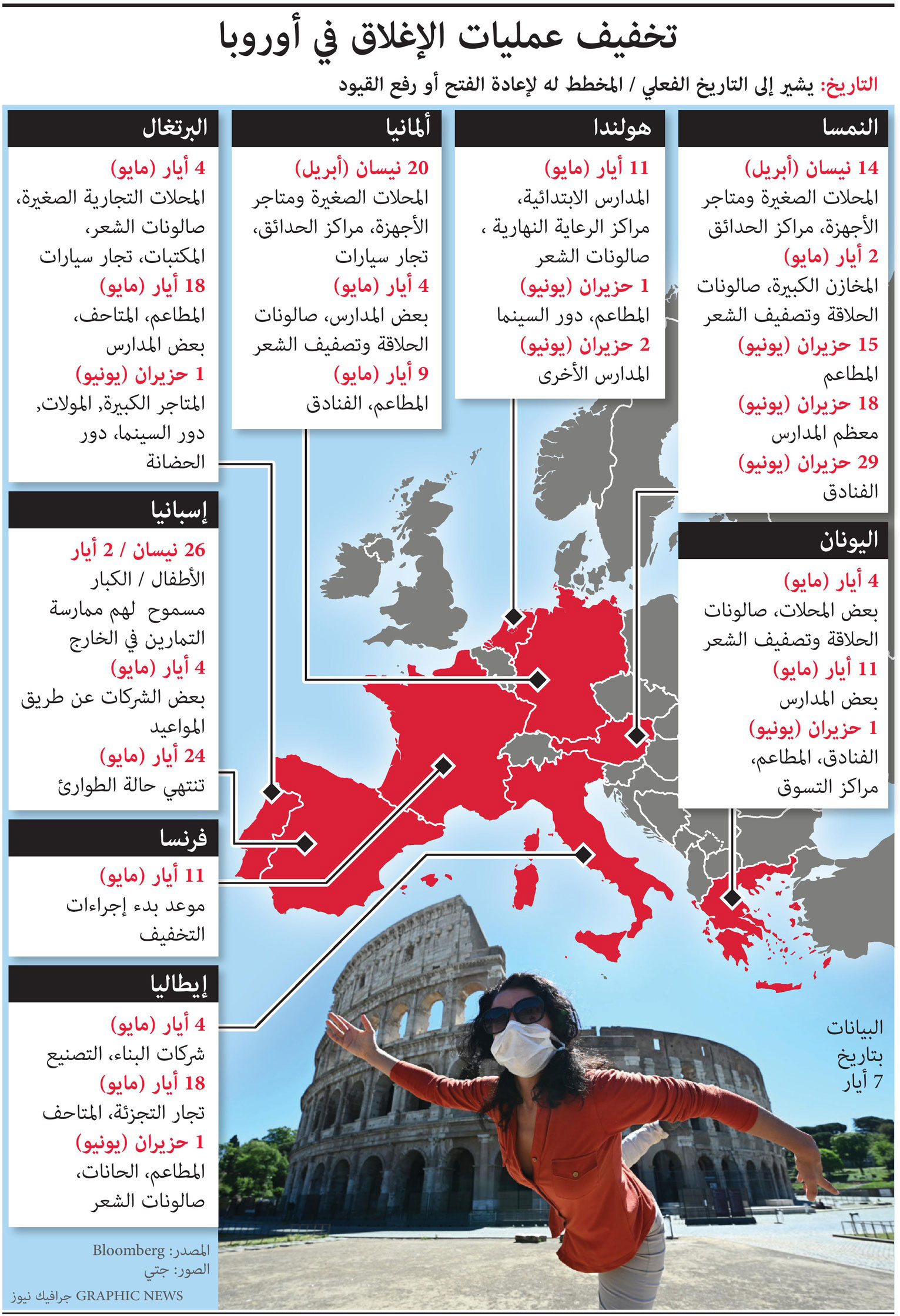 وفي لندن، كشف رئيس الوزراء البريطاني بوريس جونسون في خطاب إلى الأمة، عن نظام إنذار تحذيري من خمس درجات يتعلّق بمرض "كورونا"، أعلن خلاله الخطوات المقبلة في معركة بريطانيا ضد الجائحة التي أدت إلى فرض إجراءات عزل عام أوقفت الأنشطة الاقتصادية بالكامل تقريبا، وأبقت الملايين في منازلهم لما يقرب من 7 أسابيع.وأعلن جونسون تفاصيل نظام تحذير من 5 درجات يتراوح من الأخضر، وهو المستوى الأول إلى الأحمر، وهو المستوى الخامس لتحديد مدى الخطر من "كورونا" في المناطق المختلفة للسماح للحكومة بزيادة القيود في الأماكن التي تقتضي ذلك.وتتمتع بقية أجزاء المملكة المتحدة، وهي ويلز واسكتلندا وأيرلندا الشمالية، بصلاحيات لتحديد إجراءات العزل العام فيها، لكن من المتوقع أن تبقى متسقة بشكل عام مع ما تعلنه الحكومة في إنكلترا.وقال جونسون لصحيفة صن أمس، "هذا هو الجزء الخطير. تخطينا الذروة الآن، لكن سيكون علينا أن نعمل بجدّ أكبر لتنفيذ كل خطوة بالشكل الصحيح".وذكرت وسائل الإعلام أن الحكومة ستغير شعار "ابقوا في المنزل" إلى "ابقوا حذرين"، مع تشجيع من لا يمكنهم العمل من المنزل على العودة إلى المكاتب والمصانع ما دامت قواعد التباعد الاجتماعي الصارمة متّبعة.