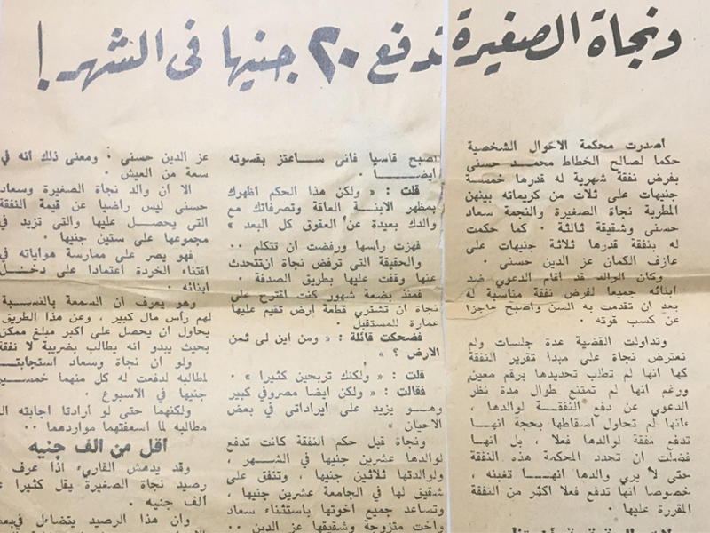 فوجئ جمهور المطربة نجاة بخبر منشور في مجلة “آخر ساعة” يوم 6 مارس 1961، حول صدور حكم من محكمة الأحوال الشخصية في القاهرة، لمصلحة الخطاط محمد حسني البابا، بغرض نفقة شهرية له، قدرها 5 جنيهات شهرياً، على ثلاث من كريماته بينهن المطربة نجاة، والسندريلا سعاد حسني، وشقيقة ثالثة، كما حكمت له بنفقة قدرها ثلاثة جنيهات على ابنه الملحن عزالدين حسني.وكان الوالد أقام دعوى ضد أبنائه جميعاً، لفرض نفقة مناسبة له بعد أن تقدمت به السن، وأصبح عاجزاً عن كسب قوته، وفي ذلك الوقت كانت نجاة في قمة نجاحها الفني، ولحقت بها شقيقتها سعاد لتصبح نجمة سينمائية، واستقلت كل منهما بحياتها الخاصة بعيداً عن منزل الأسرة، وحينئذ كانت نجاة متزوجة، وأنجبت طفلها الوحيد (وليد)، وسرت أقاويل أن والدهما قطع علاقته بابنتيه، رغم تشجيعه لهما على احتراف الفن.وتداولت القضية عدة جلسات، ولم تعترض نجاة على مبدأ تقرير النفقة، كما أنها لم تطلب تحديدها برقم معين، وأكدت أنها لم تمتنع طوال مدة نظر الدعوى عن دفع النفقة لوالدها، ولم تحاول إسقاطها بحجة أنها تدفعها لوالدها فعلاً، حتى لا يرى أنها تغبنه أو تسيء إليه، خصوصاً أنها تدفع أكثر من النفقة المقررة عليها، ولا يمكن بأي حال أن تكون ابنة عاقة، وتجحد أبويها، طالما كانت على قيد الحياة.ورفضت نجاة التعقيب على الحكم، قائلة: “كيف أرد على والدي في حديث صحافي، ولو أن المحكمة سألتني في هذا الموضوع، لرجوت منها أن تعفيني من الرد، فليس من حق الأبناء أن يردوا على آبائهم، حتى لو أخطأوا، أما الآباء فمن حقهم أن يفعلوا مع أبنائهم أي شيء، وإنني أعتز بوالدي، وأعتز بحنانه، ولو أصبح قاسياً، لاعتززت بقسوته أيضاً”.المثير أن نجاة كانت تدفع لوالدها عشرين جنيها قبل حكم النفقة، ولوالدتها ثلاثين جنيهاً، وتساعد جميع إخوتها، باستثناء سعاد حسني وأخت متزوجة وشقيقها عزالدين، وبدورها رفضت السندريلا أن تتحدث في هذا الموضوع، واكتفت بأن تقول إن والدها في سعة من العيش وأنها تدفع له نفقة أكثر من التي قررتها له المحكمة، وتوازي النفقة التي تدفعها له نجاة، أي 20 جنيهاً في الشهر، وأنه يتقاضى ما يقرب من هذه النفقة من شقيقها عزالدين، وبذلك يتقاضى منهم نحو 60 جنيها (وهو مبلغ كبير في ذلك الوقت)، أي أكثر مما قضت به المحكمة، ولا يمكن بحال أن تسيء إلى والدها، ولا تنسى تشجيعه لها على احتراف التمثيل، وكيف عهد إلى صديقه الفنان عبدالرحمن الخميسي بتدريبها، والأخير قدمها للمخرج هنري بركات الذي منحها دور البطولة في فيلم “حسن ونعيمة” 1959 مع المطرب الصاعد -آنذاك- محرم فؤاد، وحقق نجاحاً كبيراً وقتذاك.وتبين أن السر في دعوى الخطاط محمد حسني البابا ضد أبنائه، أنه ينفق مبالغ كبيرة، لإصراره على ممارسة هوايته في اقتناء “الخُردة”، وفي ذلك الوقت لم يكن توقف عن العمل خطاطا في إحدى الصحف المصرية، وأغلق ملف هذه القضية، ولم يعرف أحد هل تصالح مع أبنائه أم ظلت الخصومة قائمة حتى وفاته في 6 يوليو 1969، أي بعد 8 أعوام من دعوى النفقة.البقية في الحلقة المقبلة
