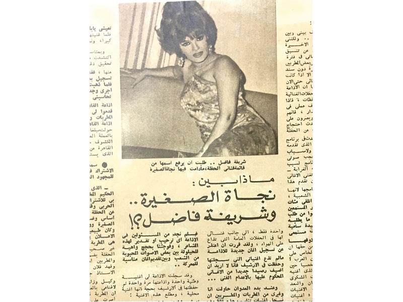 أثارت المطربة شريفة فاضل أزمة مع زميلتها نجاة، واعتذرت عن عدم المشاركة في إحياء حفلة للمجهود الحربي، وكشفت عن الأسباب في حوار أجرته معها مجلة «الكواكب» في 17 أكتوبر 1967، وقالت صاحبة أغنية «الليل»: «حدث أن اتصل بي الأستاذ وجدي الحكيم المخرج بإذاعة صوت العرب، للاشتراك في حفلة للمجهود الحربي، وقال لي إن الإعلانات عن الحفلة قد صُممت وطُبعت على أساس وضع صورة للمطربة نجاة الصغيرة، ووضع اسمي من دون صورة”.وتابعت فاضل: «كان طبيعياً أن أعتذر، لأن هذا الإعلان يوحي أن نجمة الحفلة هي نجاة الصغيرة، وهذا غير صحيح بالمرة، فبرنامج الحفلة يضم أسماءً لامعة من المطربين والمطربات، أمثال محمد رشدي، وفهد بلان وغيرهما، ثم اتصل بي جمال الغز مدير مكتب وكيل وزارة الشؤون الاجتماعية، لإقناعي بالعدول عن الاعتذار، وقال إن نجاة هي التي أصرت على عدم وضع صورتي، فتمسكت باعتذاري، لأنه ليس من المعقول أن تفرض نجاة الصغيرة آراءها، فهي ليست أم كلثوم، حتى تحيط نفسها بهالة من الدعاية على حساب سمعة فنانين وفنانات يتفوقون عليها بمكانتهم الشعبية، وأغانيهم تجري على كل لسان، وإيرادات بيع اسطواناتهم تشهد بتقدير الجماهير لهم، وحبها لأغانيهم”.بدورها، لم تعلق نجاة على هجوم فاضل، وقررت الأخيرة ألا تشترك في أي حفلة تغني فيها «نجاة الصغيرة»، وطلبت من المشرفين على تنظيم حفلات المجهود الحربي أن يضعوها في حفلة أخرى.
