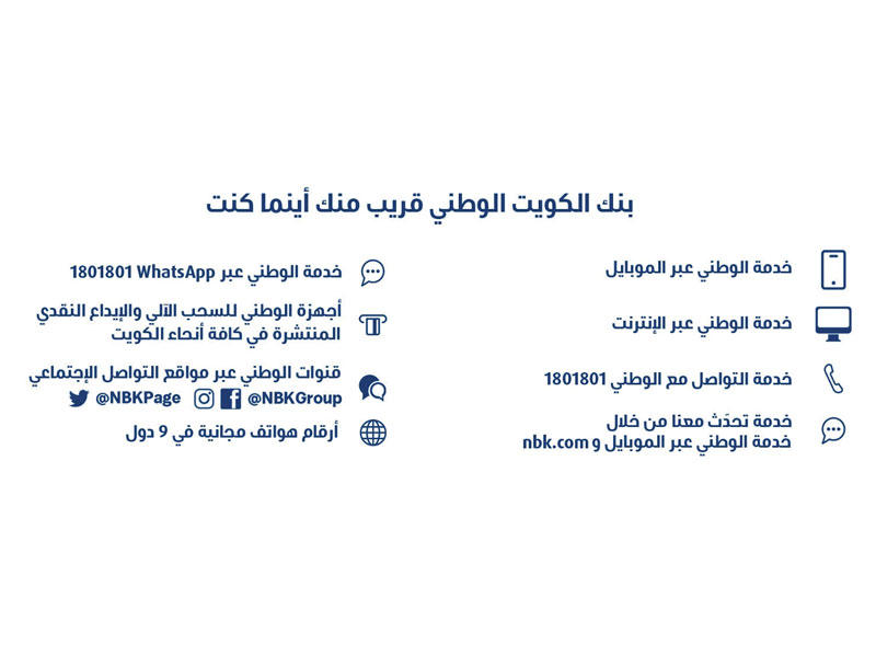يحرص بنك الكويت الوطني منذ بداية الأزمة الصحية على تقديم خدماته من خلال قنواته المختلفة ومنها الفروع التي عمد إلى زيادة عددها لتصل إلى 17 فرعاً عاملاً، لكن بناءً على تعليمات مجلس الوزراء بتطبيق الحظر الشامل في البلاد، تم إيقاف العمل في جميع فروع البنك، على أن يعاود العمل بعد الانتهاء من فترة الحظر الكلي.وتنفيذاً لتعليمات السلطات الصحية الخاصة بتطبيق قواعد التباعد الاجتماعي وحفاظاً على سلامة الجميع، تم خلال فترة الحظر الجزئي القيام بمجموعة من الإجراءات الوقائية، منها قياس درجة حرارة العملاء عند الوصول إلى الفروع وطلب ارتداء الكمامات والقفازات الطبية قبل الدخول، كما تم تنظيم عدد العملاء داخل الفرع وترك مسافة محددة بينهم.ويقدم البنك خدماته للعملاء أيضاً من خلال أجهزة الوطني للسحب الآلي والإيداع النقدي المتوفرة في كل أنحاء الكويت من خلال 327 جهاز سحب آلي من ضمنها أكثر من 100 جهاز إيداع نقدي. كما قام البنك قبل بدء فترة الحظر الكلي بتوفير جهاز سحب آلي متنقل في منطقة المهبولة، حرصاً منه على تلبية احتياجات عملائه في ظل الظروف الراهنة ودعماً منه للجهود الحكومية في هذا الصدد، يوجد جهاز الوطني للسحب الآلي المتنقل يومياً في منطقة المهبولة من الساعة 9 صباحاً حتى 3 عصراً، ويقدم خدماته أيضاً للعملاء خلال فترة الحظر من خلال جهاز الصراف التفاعلي في مبنى الركاب T4 بمطار الكويت الدولي.دعم العملاء