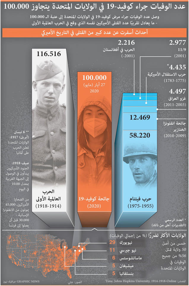 في هذا السياق تجاوزت الولايات المتحدة أمس الاول عتبة الـ100 الف وفاة، وهو رقم وسطي بين التوقعات التي قدرت وفاة 60 ألف أميركي بالوباء وأخرى تحدثت عن نحو نصف مليون، كما أحصت جامعة جونز هوبكنز نحو 1.7 مليون إصابة.وأعلى عدد وفيات سجل في ولاية نيويورك، ثاني ولاية تعد أعلى كثافة سكانية، مع ثلث الوفيات في البلاد، لكن أكبر قوة في العالم تتقدم نحو العودة الى النشاط الاقتصادي العادي، وستفتح كازينوهات لاس فيغاس أبوابها اعتبارا من الأربعاء المقبل، بعد إغلاقها لأكثر من شهرين، وهي أنباء سارة لنيفادا التي تعتمد بشكل كبير على هذه الصناعة من أجل رفاهها الاقتصادي.وتبدأ العاصمة الفدرالية واشنطن تخفيف العزل اعتبارا من اليوم، عبر إعادة فتح صالونات تصفيف الشعر والمقاهي والمطاعم، وعبّرت رئيسة البلدية مورييل بوسر عن رغبتها في ان يتم تحديد وعزل الأشخاص المصابين، «وهذا يتم عبر اجراء الفحوصات».وحسب إحصاء نشرته صحيفة «واشنطن بوست» أمس، فقد أعلن نصف الاميركيين ممن شملهم الاحصاء أنهم «سيوافقون على أخذ لقاح في حال التوصل اليه»، في حين نقلت شبكة CNN الاخبارية، عن مراكز السيطرة والوقاية من الامراض في الهيئة الاميركية المعنية بالصحة، ان «فحوصات الاجسام المضادة تعطي نتيجة خاطئة في نصف المرات».أوروبا