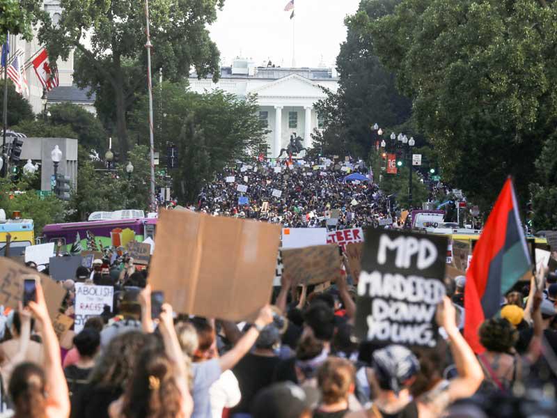 إلى ذلك، ذكرت شبكة "سي.بي.إس" أن البيت الأبيض يرغب في نشر نحو 10 آلاف جندي من العاملين في الخدمة للسيطرة على أعمال العنف والنهب في العاصمة واشنطن والولايات أخرى.وقال مسؤول بارز بوزارة الدفاع، إن وزير الدفاع مارك إسبر ورئيس هيئة الأركان مارك ميلي اللذين رفضا استخدام أي من القوات العاملة قد نقلا على ما يبدو 1600 من الجنود العاملين إلى العاصمة، للرد حال الضرورة. غير أن قوات الحرس الوطني البالغ عددها خمسة آلاف جندي والموجودة بالفعل هناك، لم تحتج لمساعدة، وبدأت القوات العاملة المغادرة ليلة الخميس الماضي.ومع دخول الأسبوع الثاني، شهدت كل الولايات أمس الأول، احتجاجات ضد التمييز العنصري اعتبرها الإعلام الأكبر، وعمت التظاهرات المدن الرئيسية من نيويورك إلى لوس أنجلس، لكن واشنطن احتلت مركز الصدارة مع تدفق الآلاف إلى الشوارع المحيطة بالبيت الأبيض الذي سُيّج بالحديد.وفي يوم مشمش وحار جداً، وضع كثيرون كمامات للوقاية من فيروس كورونا المستجد. ووزع متطوعون زجاجات مياه ولوازم أخرى مع وجود عربات بيع طعام وباعة يروجون أقمصة تحمل شعار "حياة السود مهمة".وفي واشنطن، رحب العديد من المتظاهرين السود بالتنوع العرقي والإتني بين المتظاهرين، معتبرين أن في ذلك تغييراً "منعشاً". راقب عناصر من الجيش التجمّع، وطافت طوّافات في الأجواء بينما رقص بعض المتظاهرين وصاح آخرون "هذه ليست حفلة!".ومنعت العوائق وحراس غير مسلحين متظاهرين من الوصول إلى عتبات نصب لينكولن التذكاري حيث ألقى أيقونة حركة الحقوق المدنية مارتن لوثر كينغ خطابه الشهير "لدي حلم" عام 1963 مطالباً بإنهاء العنصرية في الولايات المتحدة.وخارج الولايات المتحدة، تواصلت تظاهرات التضامن مع احتجاجات أميركا.