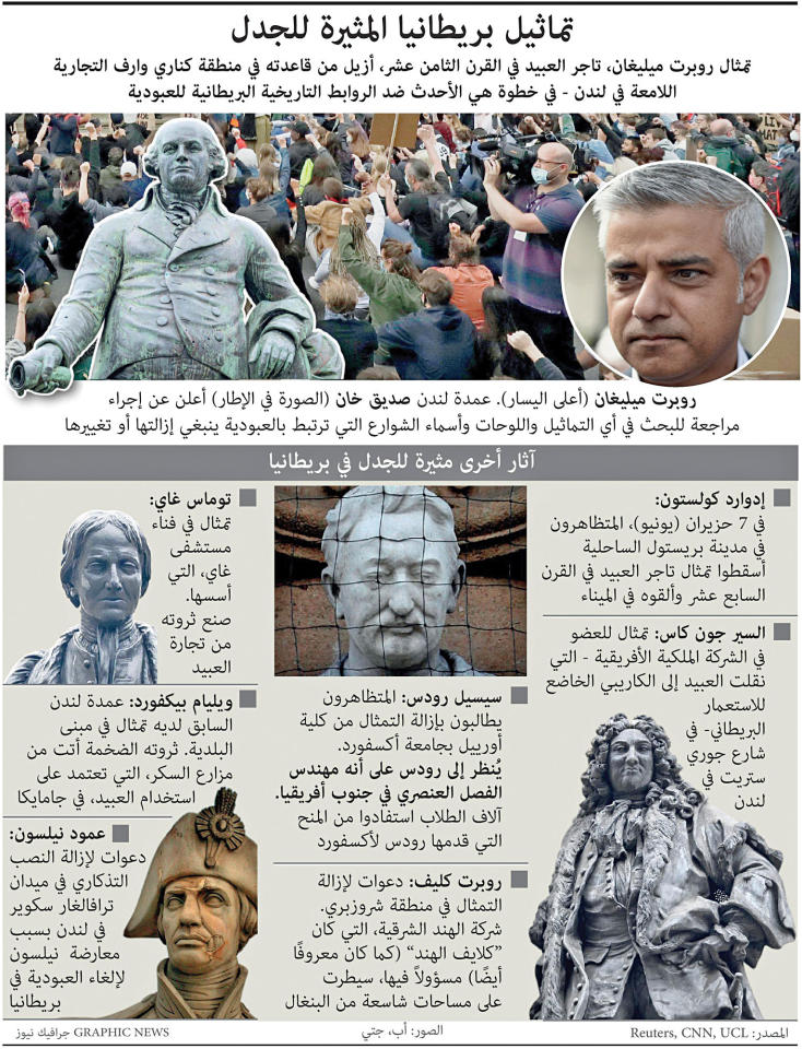 ومنذ خروج الاحتجاجات على مقتل جورج فلويد، تركز غضب المتظاهرين على تماثيل لرموز الحرب الأهلية الجنوبيين والعلم الكونفدرالي وتماثيل لمكتشف اميركا كريستوفر كولومبوس، الذي يرجع إليه فتح الأميركيتين أمام المستعمرين الأوروبيين.وأسقط المحتجون في مدينة ريتشموند بولاية فيرجينا تمثال كولومبوس، وأشعلوا النار فيه، ومن ثم ألقوه في الماء، فيما قطع محتجون آخرون في بوسطن رأس تمثاله في حديقة أتلانتيك أفينو.وأظهرت مقاطع فيديو في وقت متأخر أمس الأول تمثالاً لرئيس الكونفدرالية جيفرسون ديفيس ملقى بالشارع في ريتشموند في فرجينيا، بعد إزالته من قاعدته، بعد أيام من إسقاطهم تمثال وليام كارتر ويكهام على بعد أميال قليلة في حديقة مونرو.