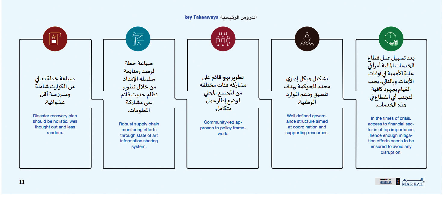 يعتبر تفعيل آلية عمل متكاملة لتخفيف الآثار السلبية لآثار الحظر على السوق الكويتي ضرورة حتمية، من خلال تشكيل فرق متعددة لتلبية الاحتياجات المتزايدة لسكان المناطق المعزولة، والاستفادة من التكنولوجيا بالطريقة الأمثل، وتقييم المناطق التي تشهد نسبة طلب عالية وعدد موظفي التوصيل في المنطقة وحركتهم وعدد الموردين، فضلاً عن تفعيل خدمة التوصيل أثناء فترة حظر التجول، ومنح المتطوعين المزيد من التصاريح للمساعدة في حالة نقص القوى العاملة. وفيما يتعلق بالتحديات التي تواجهها الأطراف ذات العلاقة المختلفة، يمكن عقد مشاورات جماعية مع الأطراف من القطاعات المختلفة، للوصول إلى حلول متكاملة والتنسيق بشكل أفضل لضمان خدمة جميع فئات المجتمع قدر المستطاع. أما على مستوى القطاع الطبي، فيمكن تشكيل فرق خاصة لتوصيل متطلبات المرضى والتعامل مع هذه الحاجة على أنها أولوية، للتخفيف من الضغط على القطاع.واقترح تقرير «المركز» صياغة خطة وطنية للتعافي من الكوارث شاملة ومدروسة تشمل تسهيل عمل قطاع الخدمات المالية كضرورة حتمية في أوقات الأزمات، وتشكيل هيكل إداري محدد للحوكمة بهدف تنسيق ودعم الموارد الوطنية، وتطوير نهج قائم على مشاركة فئات مختلفة من المجتمع المحلي لخلق إطار عمل متكامل، وصياغة خطة لرصد ومتابعة سلسلة الإمداد من خلال تطوير نظام حديث قائم على مشاركة المعلومات.تأثر القطاع المالي بتقييد الحركة
