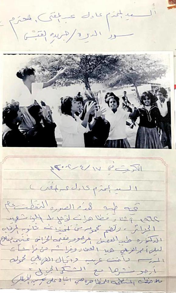 جلوسي الدائم بالبيت هذه الأيام، نتيجة الحظر الذي أرادته الحكومة لنا، جعلني أُنبّش في كل الأدراج والخزائن والأرفف وفي كل مكان بالبيت، لإعادة ترتيب الوثائق والصور والأوراق والرسائل، ومن بين ما وقعت يدي عليه هذه الرسالة والصورة من السيدة الفاضلة المرحومة إقبال علي سيد ياسين الغربللي، يرحمها الله، وكانت في عام 1962 طالبة بمدرسة ثانوية المرقاب للبنات. وهذه المدرسة كانت الثانوية الوحيدة بالكويت في ذلك الوقت، لقلة عدد سكان الكويت، وقد خرّجت رائدات لخدمة الكويت في كل المجالات، في دفعاتها الأولى، ومنهن شقيقتي التي ابتُعثت إلى بريطانيا في عام 1960، وتخرجت من جامعة أكسفورد. وعلى العموم، الموضوع عن الرسالة أعلاه... تقول الفاضلة السيدة إقبال الغربللي إن ثانوية المرقاب في عام 1962 شهدت مظاهرات تأييد للشعب الجزائري، لنيل حريته واستقلاله، وتأكيداً لكلامها، ورغم بُعد الجزائر عن الكويت في القارة الإفريقية فإن وعي الكويتيين زاد وتنامى، وكان الشعور العربي القومي في أبدع صوره ومظاهره، حين خرجت طالبات ثانوية المرقاب بقيادة المرحومة إقبال الغربللي في محيط المدرسة، وهي كما تبدو في الصورة محمولة على أكتاف إحدى فرّاشات المدرسة، وهي تندد بالاستعمار الفرنسي، مطالبة باستقلال الجزائر، وحولها الطالبات يهتفن معها.