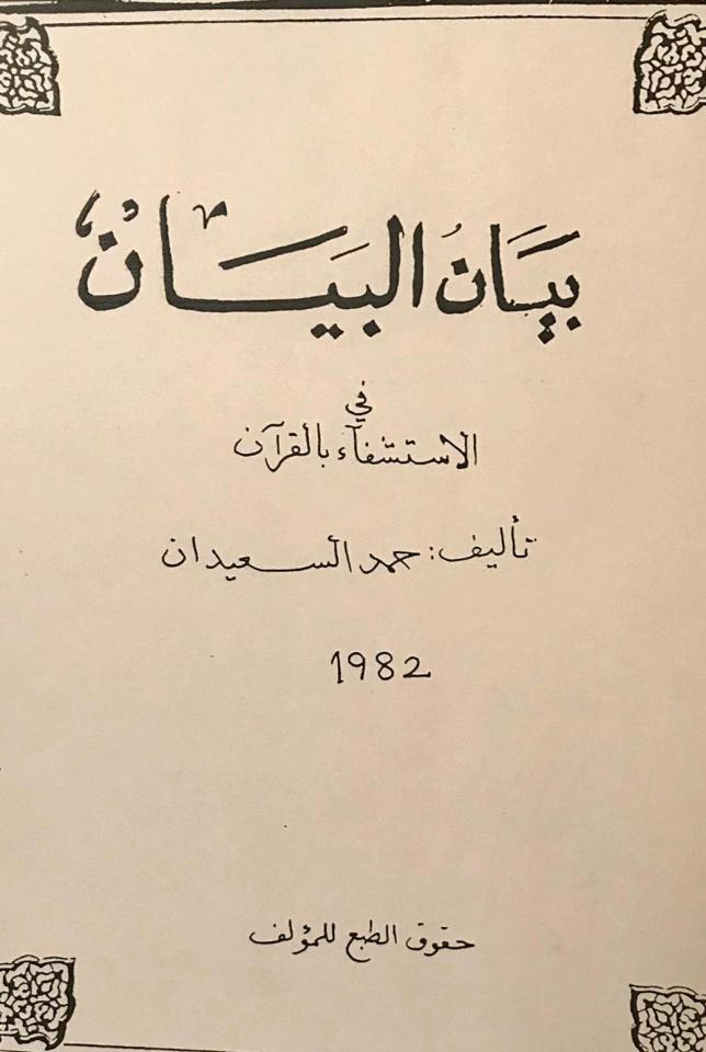 في ثمانينيات القرن الماضي، وخلال عملي قائماً بالأعمال بسفارتنا في أبوظبي، أرسل لي الصديق الباحث في التراث الكويتي الأستاذ حمد السعيدان، طيَّب الله ثراه، نسخة من مخطوطته (بيان البيان في الاستشفاء بالقرآن)، التي لم ترَ النور حتى وقتنا الحاضر، وفي هذه المخطوطة آيات مُستخلصة تُقرأ لكل داء، وما يصيب الإنسان من الأمراض العضوية والنفسية والعين والحسد، ولتسهيل الأمور الدنيوية.ويقول صاحب المخطوطة في المقدمة: "هذه مجموعة من الآيات القرآنية الجليلة مختارة بعناية لشفاء الأمراض والعلل التي تناسب الإنسان من العوارض الروحانية التي يعجز الطب عن علاجها، ومناسبة لمن أراد الانتفاع بها، عوضاً عن الطب، فهي من تجاربي، وقد جمعتها من القرآن الكريم ومن السُّنَّة المطهرة، وبعضها تلقيته على أيدي عدد من الفقهاء والصالحين"!تقع المخطوطة في حوالي ٨٠٠ صفحة من الحجم الكبير، وتم ترتيب الأمراض والعلل وفق التسلسل الأبجدي، لسهولة الوصول إلى المرض المُراد علاجه، فمثلاً في باب "الصاد" أورد عن الصداع أو الألم الذي يصيب الرأس.
