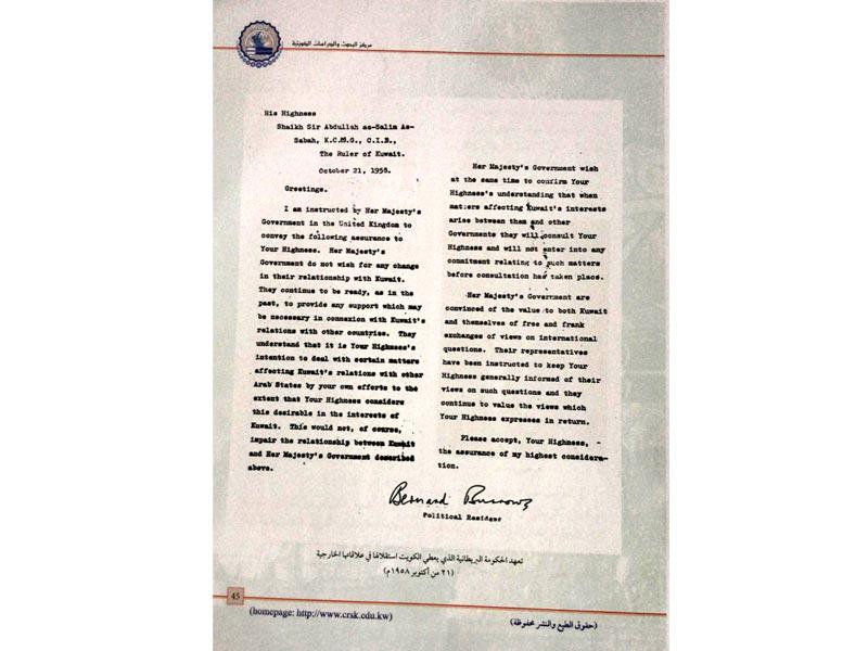 أهم مكسب استطاع الشيخ عبدالله السالم انتزاعه وتحقيقه في وقت مازالت الكويت فيه تحت الحماية البريطانية هو تعهدها بأنه "عندما تنشأ أمور ذات تأثير على مصالح الكويت بينها وبين الحكومات الأخرى، ستقوم باستشارة الأمير ولن ترتبط بأية تعهدات لها علاقة بتلك الأمور إلا بعد استشارة سموه". أثناء تلك المفاوضات التي تمت بين عامي 1958 و1959 كان الأمير يحرص على إرسال تقرير إلى المجلس الأعلى (يشبه صلاحيات مجلس الوزراء) يطلعه فيه على نتائج اللقاءات، ويطلب من أعضائه المشورة وإبداء الرأي. وفي الحلقة الثالثة من هذه السلسلة، التي تنشر في الإصدار الخاص بمركز البحوث والدراسات الكويتية "رسالة الكويت" لشهر يونيو 2020، أورد المذكرة الصادرة من سكرتير الحكومة إلى المجلس الأعلى يبين فيها مضمون اللقاءات التي تمت في النصف الثاني من عام 1958. وكان الغرض الرئيسي من المباحثات الاتفاق فيما بين الكويت وبريطانيا على أن التغييرات في وضع الكويت بما يكون في مصلحتها ويحافظ في الوقت نفسه على جوهر الصداقة والعلاقة القائمة بينهما.