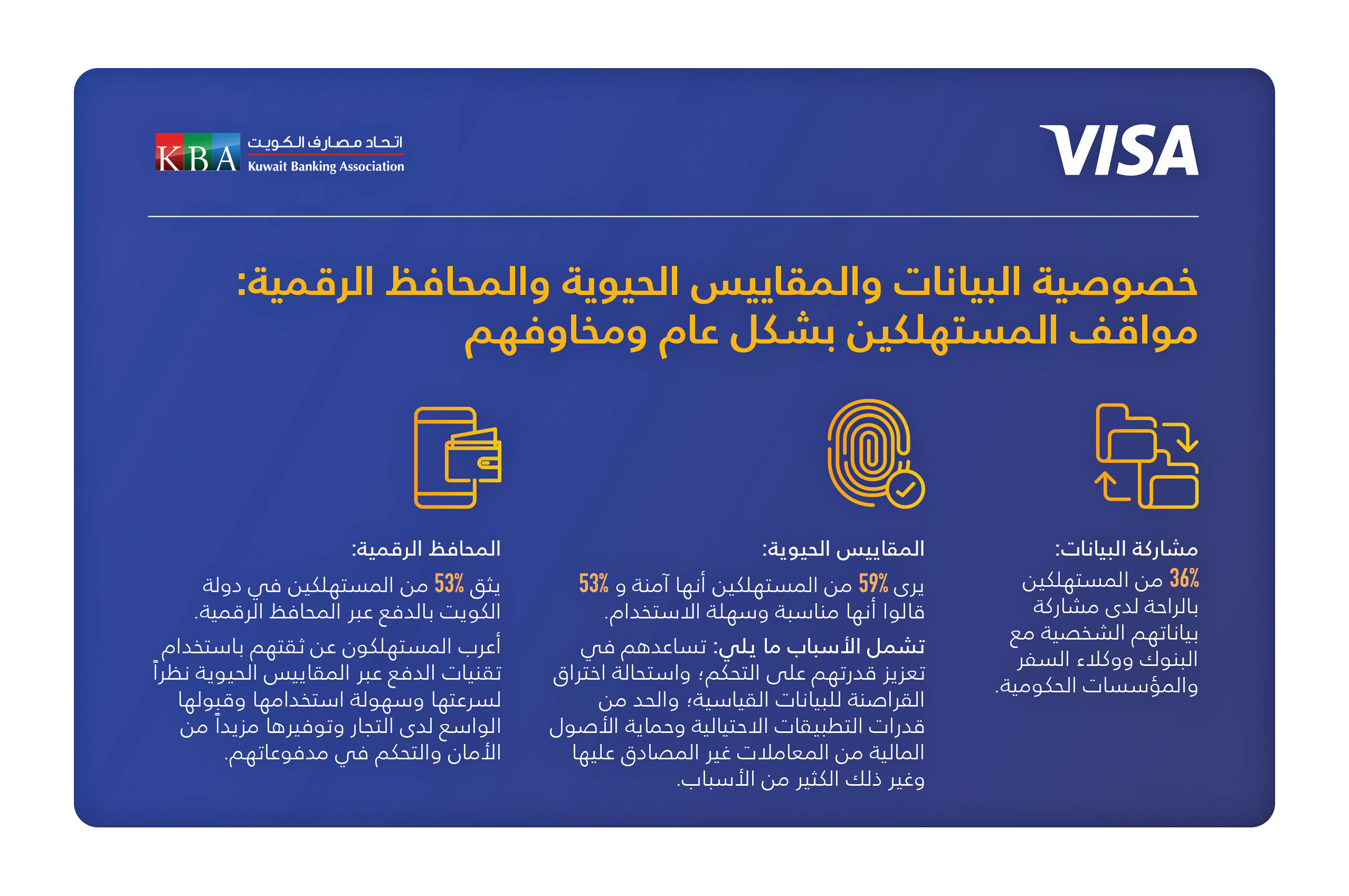 أعرب حتى 36 في المئة من المشاركين عن ارتياحهم لمشاركة بياناتهم الشخصية مع البنوك ووكالات السفر والمؤسسات الحكومية، وتم تصنيف معلومات الاتصال والاسم والهوية الرسمية والمعلومات الديمغرافية كأهم البيانات التي تحتاج إلى الحماية. وأشاد 59 في المئة من المستهلكين بأمان المقاييس الحيوية، كما قال 53 في المئة منهم إنها وسيلة سهلة الاستخدام. وعلى صعيد المحافظ الرقمية، قال 53 في المئة من المستهلكين إنهم يثقون بالدفع باستخدامها. وتستخدم المحافظ الرقمية على غرار Apple Pay وSamsung Pay تقنية الترميز من Visa والتي تستبدل بيانات البطاقة الحساسة مثل رقمها المكون من 16 خانة وتستخدم عوضاً عنه رمزاً "توكن" مكوناً من رقم عشوائي لحماية معلومات حساب حاملي البطاقات عند الدفع في المتجر أو عبر الإنترنت.من جهته، قال نيل فيرنانديز مدير إدارة المخاطر في Visa الشرق الأوسط وشمال إفريقيا: "أدى وباء كوفيد-19 إلى تغيير طريقة المستهلكين في التسوق والدفع، في ضوء تفضيل وإقبال متزايدين على التسوق عبر الإنترنت. ونتيجة للاستخدام المتزايد للتسوق الإلكتروني بين المستهلكين المتمرسين أو الجدد، يحرص قراصنة الإنترنت أيضاً على اغتنام هذا النشاط المتزايد ونقاط الضعف خاصة لدى المتسوقين للمرة الأولى. ومن هنا تأتي أهمية توعية المستهلكين بسلوكيات الدفع الآمنة، ليس فقط خلال الفترة الراهنة، بل تزامناً مع مضينا قدماً نحو التكيف مع الوضع الطبيعي الجديد. ويسعدنا التعاون مع اتحاد مصارف الكويت مجدداً لمواصلة مهمتنا في تمكين المستهلكين من الاستمرار باستخدام المدفوعات الرقمية وقنوات الدفع الإلكترونية بثقة كاملة".