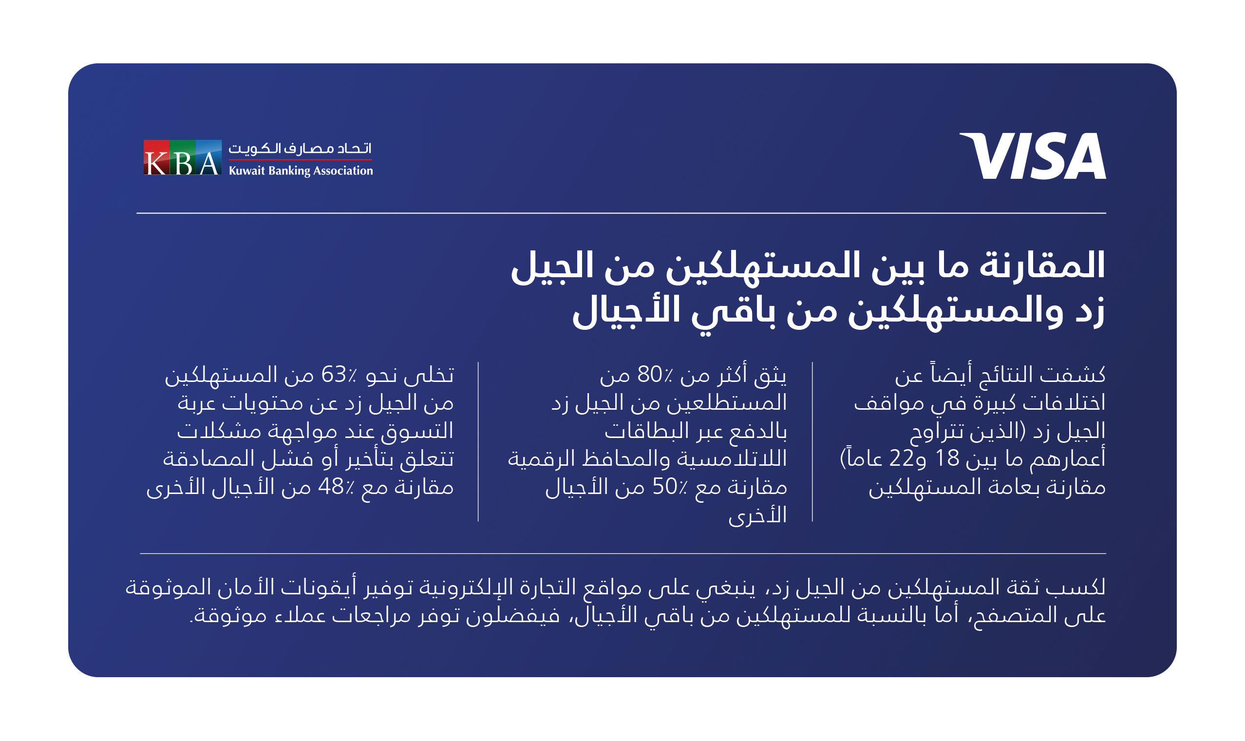 كشفت النتائج أيضاً عن اختلافات كبيرة في انطباعات الجيل z (الذين تتراوح أعمارهم بين 18 و22 عاماً) مقارنة بعامة المستهلكين. فمثلاً، مقارنة مع 50 في المئة من الأجيال الأخرى، أظهرت الدراسة أن نسبة أعلى (أكثر من 80 في المئة) من المستهلكين من الجيل z يثقون بالبطاقات اللاتلامسية والمحافظ الرقمية. وأشارت الدراسة إلى تخلي نحو 63 في المئة من المستهلكين من الجيل z عن محتويات عربة التسوق عند مواجهتهم لمشكلات تتعلق بتأخير أو فشل المصادقة مقارنة مع 48 في المئة من الأجيال الأخرى. ولكسب ثقة المستهلكين من الجيل z، ينبغي على مواقع التجارة الإلكترونية توفير شارات موثوقة وآمنة على المتصفح، في حين يتطلب المستهلكون من الأجيال الأخرى توفر آراء ومقترحات موثوقة من قبل العملاء. وفي ظل دخول أعداد متزايدة من الجيل z لسوق العمل والنمو المتوقع في قوتهم الشرائية مستقبلاً، تحمل الرؤى حول وجهات نظرهم وسلوكياتهم فائدة ملموسة للشركات الراغبة ببناء علاقات طويلة الأمد معهم.