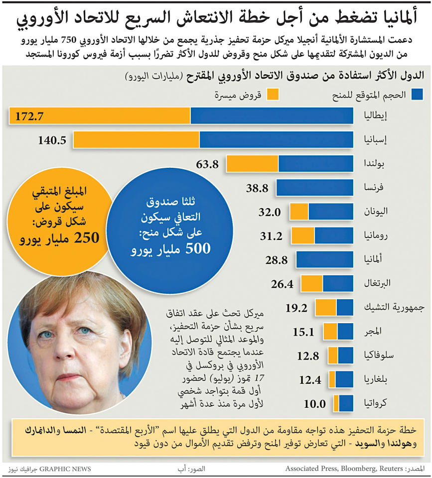 واعترفت المستشارة بأن "التوقعات الملقاة على عاتقنا ثقيلة جدا"، معبّرة عن خشيتها من صعود الشعبوية في غياب "التضامن" بين الدول الأوروبية.في مواجهة هذه الرهانات، أقرّ سفير ألمانيا في الاتحاد الأوروبي مايكل كلاوس بأنه يعاني الأرق، قائلا: "أجد صعوبة في النوم، لأنني أعتقد أن التوقعات كبيرة".ويعبر آخرون عن ارتياحهم لانتقال الرئاسة إلى ألمانيا "البلد الذي يملك أقوى اقتصاد في الاتحاد، وكان أداؤه أفضل بكثير من آخرين في مواجهة الوباء، وتقوده حكومة مستقرة في قارة تشهد حالة غليان"، كما لخصت الوضع الصحيفة الاقتصادية الألمانية "هاندلسبلات".وتمتلك المستشارة، التي تحكم البلاد منذ 15 عاماً بلا انقطاع، وهي مدة قياسية لقائد أوروبي، فرصة فريدة لدخول التاريخ الأوروبي نهائيا، ومحو الصورة السيئة التي جلبتها صرامتها خلال الأزمة اليونانية في 2011.وأطلقت هذه الرئاسة رمزياً، مساء أمس الأول، بعرض شعار "معاً لإنعاش أوروبا" بلغات عدّة على بوابة براندنبورغ الرمزية في برلين.وتبدأ الرئاسة الألمانية وسط ضجة كبيرة بقمة للقادة الأوروبيين في 17 و18 يوليو الجاري في بروكسل، حاسمة لمستقبل أوروبا.وستحاول الدول الـ27 الأعضاء في الاتحاد التوصل إلى اتفاق حول خطة إنعاش بقيمة 27 مليار يورو في مواجهة "كوفيد 19"، بأموال يتشارك الاتحاد الأوروبي، للمرة الأولى، في استدانتها بعدما وافقت ميركل على كسر واحد من المحرمات السياسية في ألمانيا لتحقيق ذلك.وعززت ميركل مثل ماكرون الاثنين الماضي الضغط على شركائهما للتوصل إلى اتفاق اعتبارا من يوليو قبل عطلة فصل الصيف.وللتوصل إلى تسوية يجب التغلب على تحفظات أربع دول توصف بـ "المقتصدة"، أي تؤيد الصرامة الميزانية، وهي هولندا والنمسا والسويد والدنمارك، المتحفظة جدا على مشروع يفترض أن يعود بالفائدة على دول الجنوب أولا، الأكثر تضررا من الوباء.وقال ماكرون محذراً إن "الدول المقتصدة الشهيرة هي بلدان تستفيد من عمل السوق الواحدة، وليس من مصلحتها أن ترى بعض الأعضاء متضررين"، معتبرا أن أوروبا أصبحت "في لحظة حقيقة". وإذا تم التوصل إلى اتفاق حول الميزانية، فستكلل الرئاسة بالنجاح لكن جزئيا بوجود مشكلة كبرى أخرى هي "بريكست".وفي حال لم يتم التوصل إلى اتفاق بحلول ذلك الوقت، فستطبق حصراً قواعد منظمة التجارة العالمية، مع الرسوم الجمركية المرتفعة والرقابة الجمركية الشديدة على المبادلات التجارية بين هؤلاء الشركاء. ومن شأن ذلك إضعاف الاقتصادات الأوروبية المتضررة أصلا من "كورونا". وأعرب رئيس حكومة ولاية بافاريا وزعيم "الحزب المسيحي الاجتماعي البافاري" ماركوس زودر، عن اعتقاده أن رئاسة ألمانيا للاتحاد الأوروبي هي "رئاسة مصيرية لأوروبا"، قائلا: "أعتقد أن الشيء الأهم هو أن ننجح في تعزيز الفكرة الأوروبية وقيادة أوروبا برمتها خلال الأزمة".