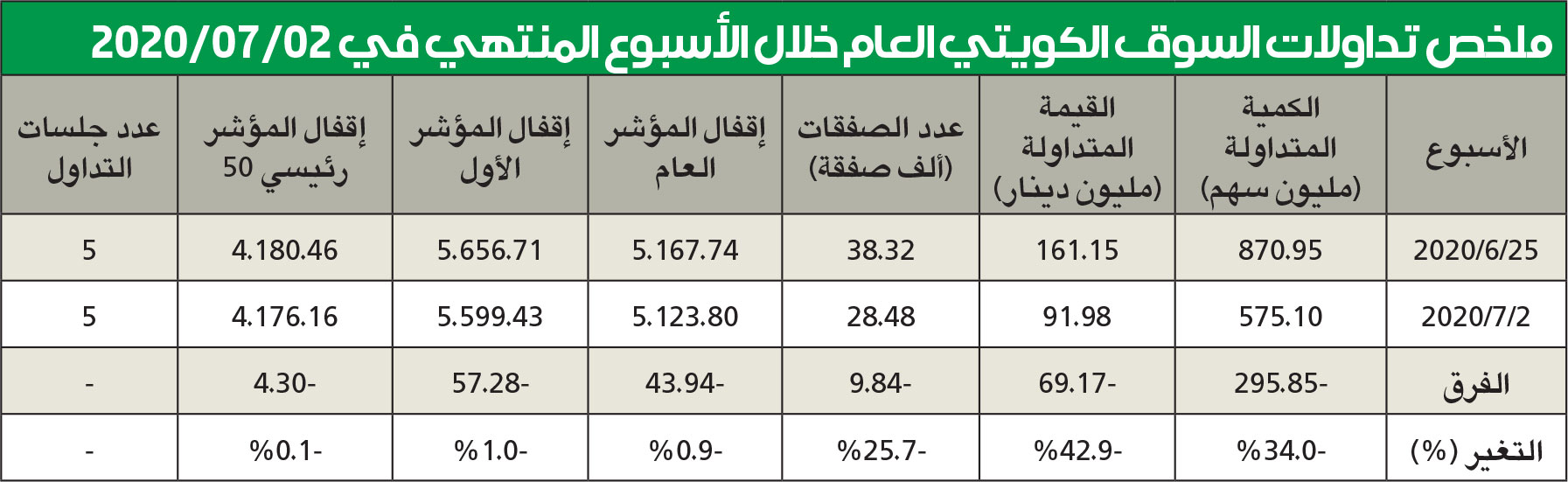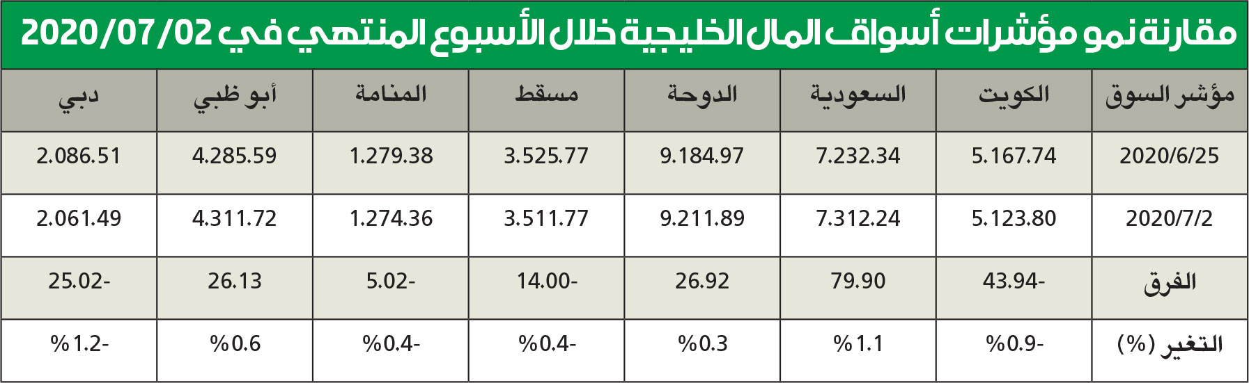 وخسر مؤشر سوق دبي نسبة 1.2 في المئة هي الأكبر خليجياً، متراجعاً إلى مستوى 2061.49 نقطة بعد ضغط نتائج الربع الأول عدا آثار الجائحة على عدة قطاعات في اقتصاد دبي خصوصاً الطيران والعقار والسياحة، وهي من القطاعات البارزة في اقتصاد الإمارة الشهيرة عالمياً، وهذه القطاعات تحتاج وقتاً أطول للانتعاش من بقية القطاعات عموماً مما أثر على التقديرات للربعين المقبلين.وخسر مؤشر السوق الكويتي العام نسبة 0.9 في المئة بعد ضغوط كبيرة خلال أربع جلسات، وكان الارتداد خلال الجلسة الخامسة فقط والتي عوضت الكثير ليقفل على خسارة ب حوالي 44 نقطة ليقفل على مستوى 5123.8 نقطة بينما تأثر المؤشر الأول وكانت خسارته بنسبة 1 في المئة أي 57.28 نقطة ليقفل على مستوى 5599.43 نقطة، وبضغط من أكبر مكوناته "الوطني" و"بيتك" و"زين" و"أجيليتي"، التي ارتدت بنهاية الأسبوع وحققت مكاسب مهمة، بينما بقي السوق الرئيسي بتداولات محدودة وخسر نسبة محدودة كذلك كانت عُشر نقطة مئوية أي 4.3 نقاط ليقفل على مستوى 4176.16 نقطة. وكان واضحاً تراجع كبير في متغيرات السوق النشاط والسيولة وعدد الصفقات إذ بقى السوق في تعطش لمعرفة نتائج النصف الأول من هذا العام الاستثنائي، وتراجعت السيولة بنسبة 43 في المئة تقريباً قياساً على مستويات الأسبوع السابق، في حين خسر النشاط نسبة 34 في المئة وتراجع عدد الصفقات بنسبة 25.7 في المئة.وتعادل سوقا مسقط والمنامة بخسارة متماثلة بنسبة 0.4 في المئة حيث فقد مؤشر السوق العماني نسبة 0.4 في المئة أي 14 نقطة ليقفل على مستوى 3511.77 نقطة وفقط مؤشر سوق البحرين نسبة 0.4 في المئة تعادل 5.02 نقطة ليقفل على مستوى 1274.36 نقطة.