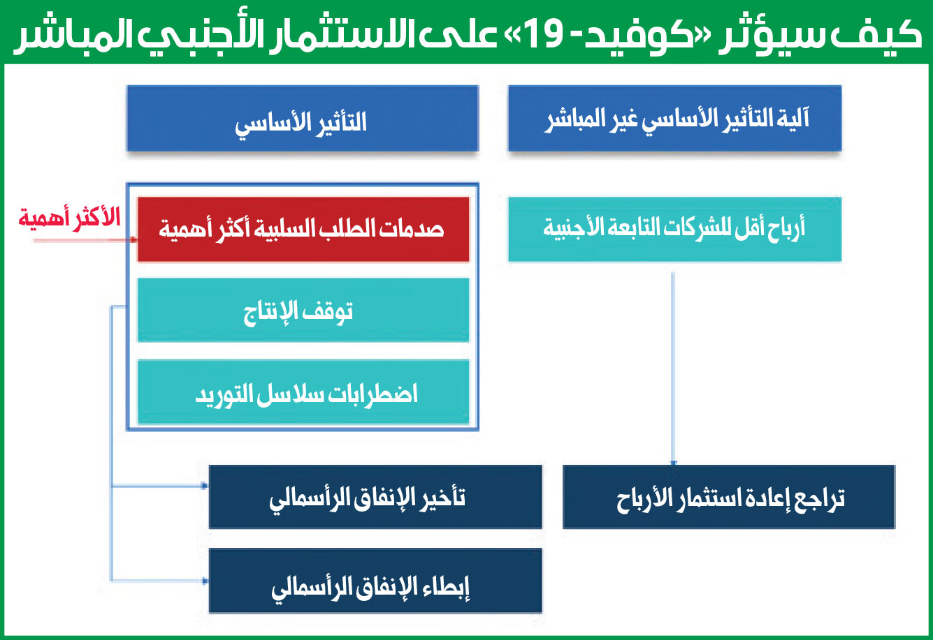 توقع تقرير «ضمان الاستثمار» أن تنخفض تدفقات الاستثمار الأجنبي المباشر الواردة إلى المنطقة العربية بنسبة تتراوح ما بين 21 في المئة في حدها الأدنى و51 في المئة في حدها الأقصى خلال عام 2020، بخسائر تتراوح ما بين 7.1 و17.2 مليار دولار.