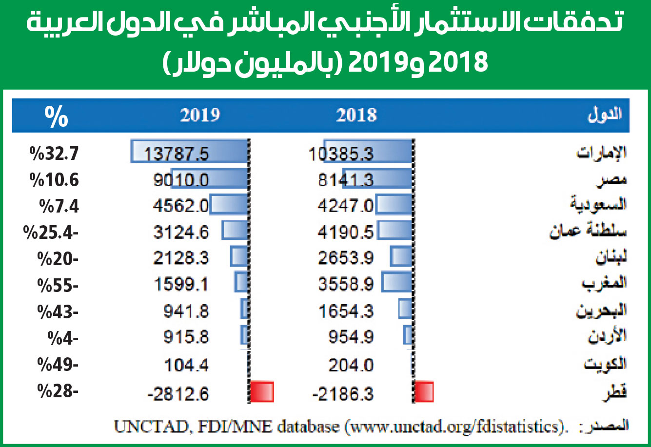 وفيما يتعلق بالأداء الاستثماري في المنطقة لعام 2019 أشار التقرير، الذي اعتمد على آخر البيانات الصادرة عن مؤتمر الأمم المتحدة للتجارة والتنمية (أونكتاد) ارتفاع تدفقات الاستثمار الأجنبي المباشر الواردة إلى الـدول العربية بشكل طفيف لتبلغ 34.7 مليار دولار عن عام 2019، لتمثل حصتها 5.1 في المئة من مجمل التدفقات الواردة إلى الدول النامية و2.3 في المئة من مجمل التدفقات العالمية البالغة 1540 مليار دولار.وحلت الإمارات في مقدمة دول المنطقة باستقبالها ما يقارب 14 مليار دولار بزيادة تقارب الثلث مقارنة بالعام الماضي، كما ارتفعت التدفقات الواردة الى السعودية للعام الثاني على التوالي بنسبة 7 في المئة لتبلغ 4.6 مليارات دولار.في المقابل تراجعت التدفقات الواردة الى الدول العربية في شمال إفريقيا بنسبة 11 في المئة إلى 13.7 مليار دولار، نتيجة انخفاض التدفقات في جميع البلدان باستثناء مصر التي حافظت على موقعها كأكبر مستقبل للاستثمار الأجنبي في إفريقيا بزيادة 10.7 في المئة لتبلغ 9 مليارات دولار.