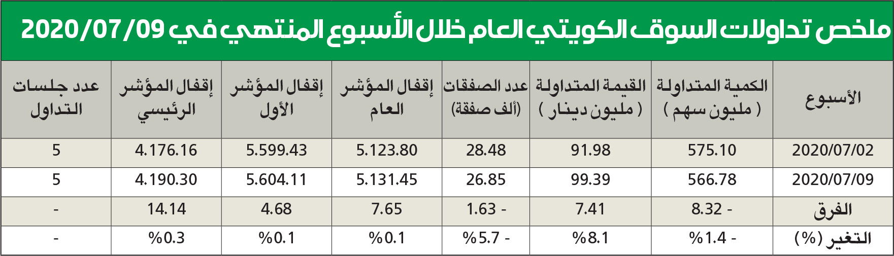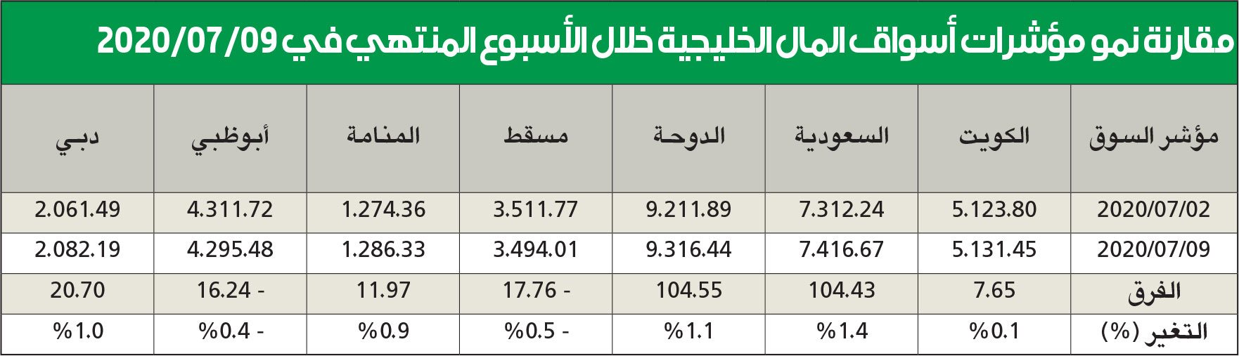 وحقق مؤشر السوق القطري ارتفاعاً مماثلاً بعدد النقاط قياساً مع السوق السعودي وهي 104.55 نقاط ولكن نسبياً أقل حيث كنت نسبة ارتفاعه 1.1 في المئة ليستقر فوق مستوى 9 آلاف نقطة ويقفل على مستوى 9316.44 نقطة، وكان متفاعلاً كثيراً مع أداء مؤشرات الأسواق المالية العالمية ومعظم مكاسبه خلال الجلسات الأولى من هذا الأسبوع، بينما انخفض مؤشر دبي بشدة خلال نهاية الأسبوع وبنسبة فاقت 1 في المئة ولكنه احتفظ بنسبة 1 في المئة إذ أقفل رابحاً 20.7 في المئة ليبقى فوق مستوى ألفي نقطة وعلى مستوى 2082.19 نقطة تحديداً.وسجل مؤشر سوق البحرين المالي مكاسب جيدة كذلك قريبة من نسبة 1 في المئة كانت تحديداً 0.9 في المئة أي حوالي 12 نقطة ليقفل على مستوى 1286.33 نقطة وقاد سهم أهلي متحد بحريني التداولات إذ كان من الأكثر نشاطاً وسيولة جنباً إلى جنب مع جي إف إتش الذي تراجع بينما سجل أهلي متحد نمواً يوازي نموه ببورصة الكويت خصوصاً خلال الجلسات الثلاث الأخيرة من الأسبوع.واستقرت مؤشرات بورصة الكويت على نمو محدود جدا لم يتجاوز عُشر نقطة مئوية لمؤشريها الرئيسين العام والأول إذ ربح العام 7.65 نقطة ليبقى قريباً من مستوى إقفاله للأسبوع السابق عند مستوى 5131.45 نقطة بينما سجل مؤشر السوق الأول وهو مؤشر الأسهم القيادية ال 18 في بورصة الكويت والأكثر نشاطاً سجل ارتفاعاً ب 4.68 نقاط ليقفل على مستوى 5604.11 نقطة وكان مؤشر سوق «رئيسي 50» أفضل قليلاً وحقق ثلث نقطة مئوية وبفضل ارتفاعات الأسهم ذات التوزيعات السنوية الجيدة وأداء تشغيلي ليحقق سوقها ثلث نقطة مئوية تساوى 14.14 نقطة وبدعم من أسهم «كابلات» و»آلافكو» و»امتياز».وارتفعت السيولة في بورصة الكويت مقارنة مع الأسبوع الأول من الشهر وبفضل تعاملات كبيرة على أسهم قيادية ومساهمة بعض الشركات التشغيلية في «رئيسي 50» مثل «كابلات» الذي زاحم الكبار في أكثر من جلسة في قائمة الأفضل قيمة بينما تراجع النشاط بعد فتور أداء الأسهم المضاربة الصغيرة خصوصاً «أبيار» الذي عاد إلى تداولاته المعتادة وانخفض عدد الصفقات وكانت تراجعهما محدود بنسبة 1.4 و5.7 في المئة تباعاً. وخسر مؤشر سوق مسقط نسبة نصف نقطة مئوية تعادل 17.76 نقطة ليقفل على مستوى 3494.33 نقطة، واستهلت شركة الأنوار للبلاط إعلانات الربع الثاني في سوق السلطنة المالي وسجلت نمواً كبيراً بنسبة 63 في المئة ويقدر أن تتدفق بيانات مجموعة من الشركات خلال هذا الأسبوع ليبقى الجميع في ترقب وحذر بغية معرفة حجم أثر كورونا على الشركات العمانية خصوصاً قطاع البنوك وهو الأهم.وخسر مؤشر أبوظبي نسبة 0.4 في المئة هي 16.24 نقطة حيث أقفل على مستوى 4295.48 نقطة وحتى بداية شهر يوليو لم تستكمل 22 شركة، وكانت خسائر مؤشر أبوظبي جميعها خلال الجلسة الأخيرة من الأسبوع التي تكبد خلالها مؤشر دبي خسارة أكبر بلغت 1.2 في المئة وبعد تقسيم السوق وإخراج الشركات ذات الخسائر التي تتجاوز 50 في المئة إلى سوق ثانوي.