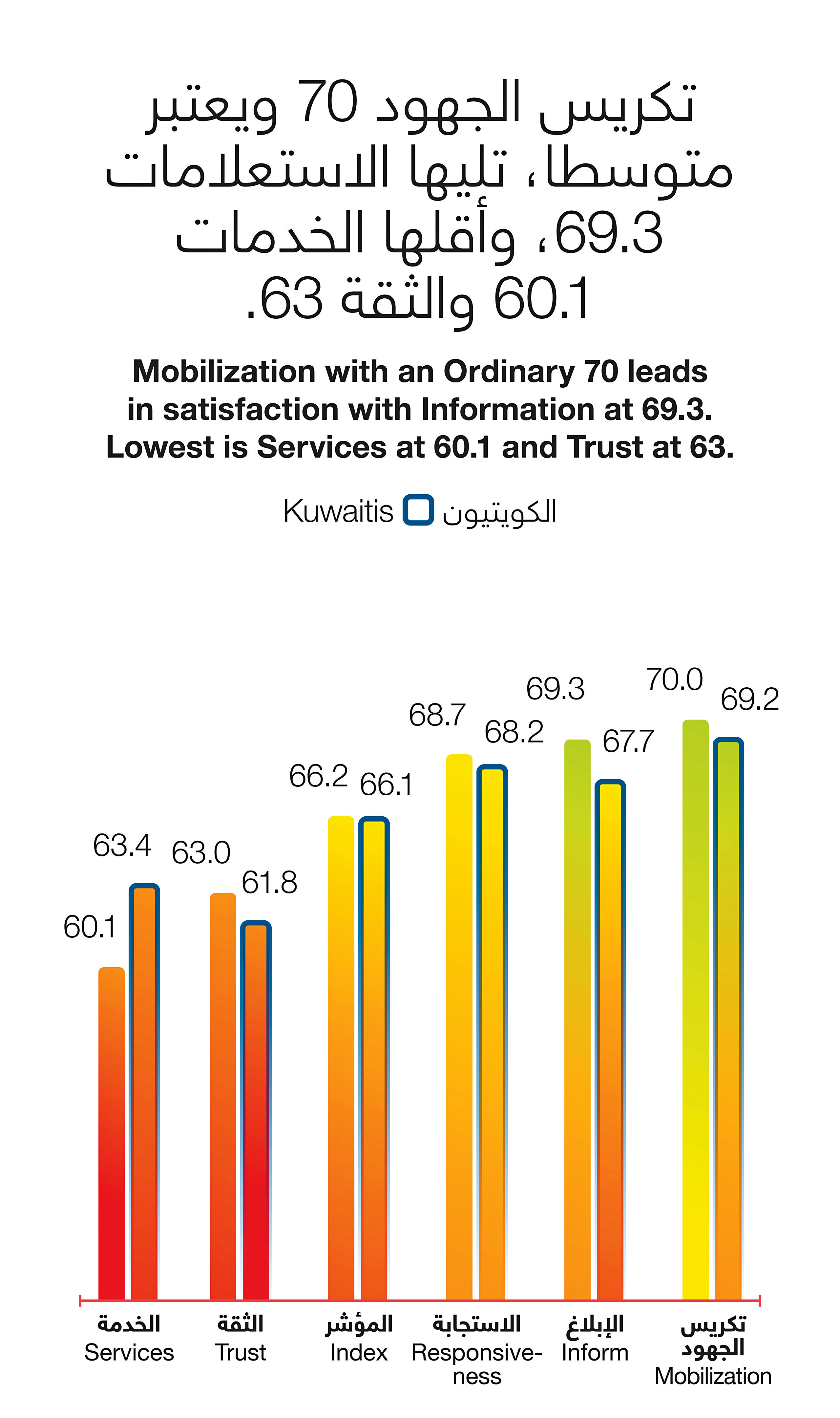 ويتم تسجيل النتائج من أصل 100 نقطة ويتم تفسيرها على النحو التالي: أظهرت نتائج الاستبيان التي أجرتها سيرفس هيرو تصدر الفرق الطبية بـ 85.1 نقطة تلتها الجمعيات التعاونية بـ 75.1 نقطة ثم الدعم اللوجستي بـ 74.5، فيما سجلت الاستجابة للأسئلة 59.4 نقطة، والدعم المالي 55.5 نقطة، وكان دعم القطاع الخاص الأقل، إذ سجل 46.0 نقطة، وجاء التقييم العام عند مستوى رضا 66.2، وكان مستوى الرضا العام بين الكويتيين عند 66.1 نقطة. وتعليقاً على هذه المبادرة لتقييم الأداء الحكومي خلال فترة الجائحة، قالت فاتن أبوغزالة، رئيسة شركة سيرفس هيرو: «لدينا في سيرفس هيرو الأدوات والمنصات المناسبة لتقييم ورصد رضا العملاء عبر مختلف الأبعاد، لكن كان دائماً نشاطنا مرتبطاً بأداء القطاع الخاص. وباعتبارنا شركة مسؤولة اجتماعياً اخترنا استخدام منصاتنا وبياناتنا الخاصة لدعم جهود حكومتنا، من خلال قياس مستوى رضا الجمهور فيما يتعلق بجهود الحكومة خلال مكافحة الوباء، والاستفادة من معرفتنا وخبرتنا في جمع الردود والتعليقات على الصعيد الوطني، إذ يمكننا من خلالها مواءمة النتائج مع الجهود الحكومية، بهدف الارتقاء بالتجربة من جميع النواحي وضمان أعلى مستوى من التميز في الخدمة ورضا العملاء».وأضافت أبوغزالة: «كانت هذه الجولة من التقييمات مهمة لسيرفس هيرو إذ إنها تؤثر على الدولة، وتوفر لحكومة الكويت رؤية مهمة حول المدى الذي وصلت إليه جهودهم، ومكونات الاستراتيجية والخطة الشاملة والتي تتطلب التغيير والتطوير». وأوضحت «أننا نقوم حالياً بجمع بيانات المرحلة الثانية، وسيتم الإعلان عن ذلك في وقت لاحق. وأود هنا أن أقدم الشكر لكل جهة حكومية كرّست وقتها ومواردها وقوتها العاملة من أجل خير ورفاهية أمتنا، وضمان رفاهية كل فرد مقيم في هذا البلد، وقد كانت وزارة الصحة في مقدمة هذه الجهود».من جانبه، قال د. خالد مهدي الأمين العام للمجلس الأعلى للتخطيط والتنمية، إنه «في محاولة لفهم أفضل فعالية الاستجابة الحكومية لمرض «كوفيدـ19» دعمت الأمانة العامة من خلال مركز الكويت للسياسات العامة التابع لها مبادرة سيرفس هيرو لتقييم استجابة الكويت للمرض الذي تم بمنهجية علمية مدروسة لجمع آراء الجمهور. وأضاف مهدي، أنه عموماً كأمانة عامة للمجلس الأعلى للتخطيط والتنمية «نتطلع إلى تطوير آليات بناء السياسات من خلال استراتيجية يتم تصميمها وفقا للادلة والقرائن، ومن الضروري أن تتمحور حول خدمة المواطنين بما يتماشى مع السياسات العامة لخطة التنمية الوطنية». وذكر أن الوباء «قادنا إلى فترة تجريبية، إذ تم دفع الحكومة على نشر كل مورد ومهارة وخبرة واستراتيجية للأزمة من أجل ضمان سلامة سكانها، وشكلت الجائحة في الواقع فرصة لنا لفهم المجالات التي تحتاج إلى تنمية أفضل والتي أثبتت صلابتها وتتطلب الدعم لاستدامتها».وأوضح أن الاستطلاع هو إضافة لما نقوم به من مشاركة شركاء التنمية في وضع السياسات الإنمائية الشاملة. «فعندما يتم استخدام المنهجيات الجديدة لبناء السياسات المقرونة بالأدلة مع دمج الآراء العامة في منهاج علمي، فعندئذ سنكون قادرين بالفعل على بناء سياسات عامة أكثر مرونة وعملية، والتي تدعم تنفيذ رؤية الكويت 2035 وجميع ركائزها».وكانت أكثر الفئات الراضية بشكل عام عن نهج الحكومة في التعامل مع الأزمة هم الكويتيون وموظفو الحكومة، والذين تجاوزوا 40 عاماً، والإناث، وسكان الجهراء ومدينة الكويت، والموظفون الحكوميون، بعكس موظفي القطاع الخاص ومن هم دون سن 40 من ذكور وجامعيين وسكان الفروانية ومبارك الكبير. وتكشف نتائج الاستبيانات فيما يتعلق بالعوامل الخمسة الرئيسية المتعلقة بإدارة الأزمات، أن تكريس الجهود سجل أعلى قدر من الرضا ليحتل المرتبة الأولى بتصنيف «عادي» عند 70.2 نقطة. وكان قد تبعه توفير المعلومات، الذي احتل المرتبة الثانية عند تصنيف «ضعيف» 69.2 نقطة ومن ثم الاستجابة للأسئلة الذي احتل المرتبة الثالثة عند 68.7 نقطة، تليها الثقة لتحتل المرتبة الرابعة عند 63 نقطة، وبالمرتب