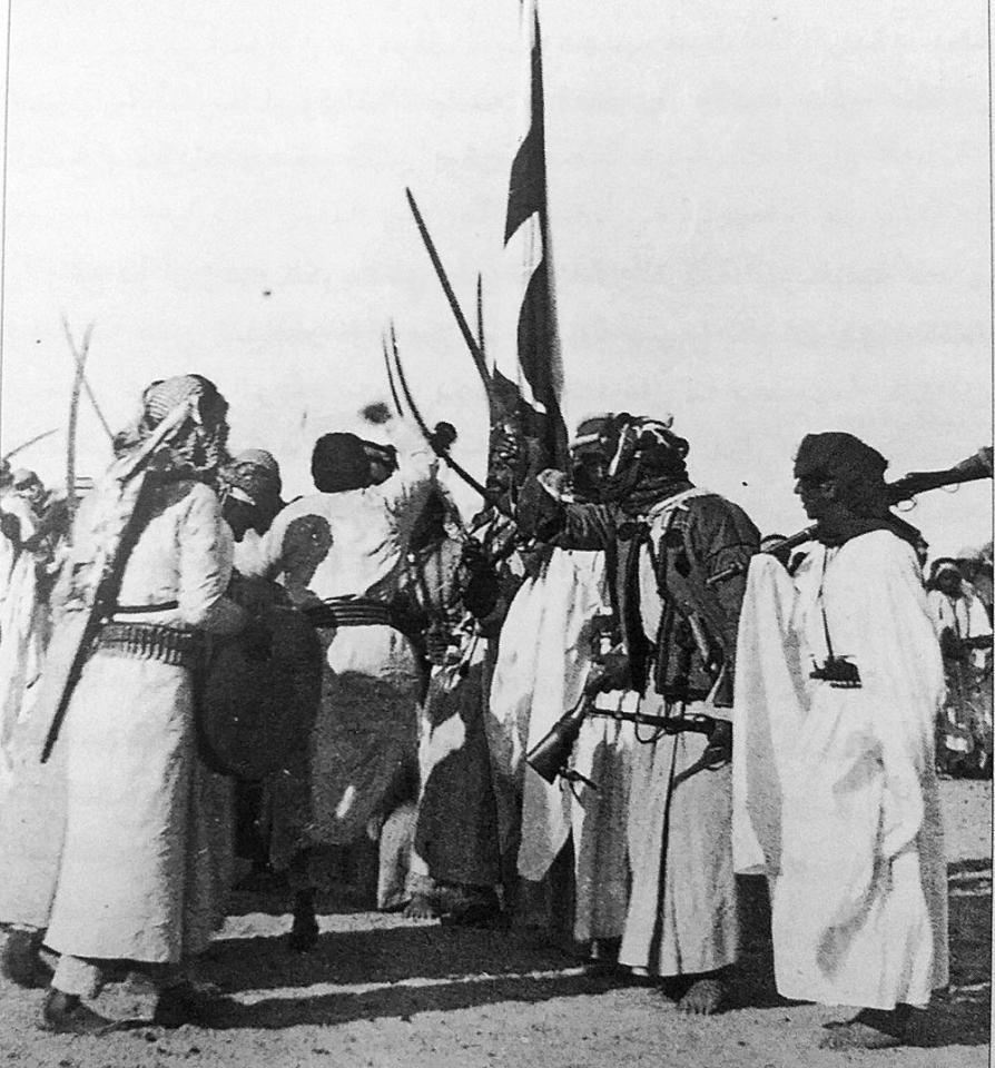 كويتيون يؤدون رقصة الحرب قرب الجهراء في ديسمبر 1901 (الصورة من كتاب الكويت في عيون أوائل المصورين)